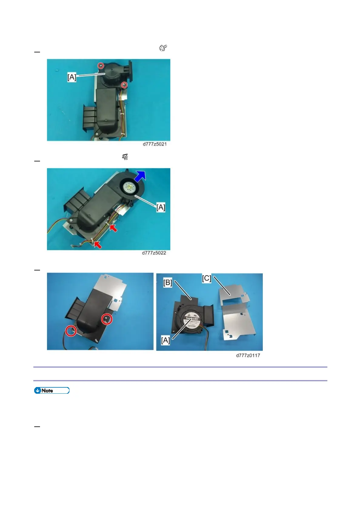 5. Separate suction fan 2 [A], the suction fan duct [B] and the bracket [C].