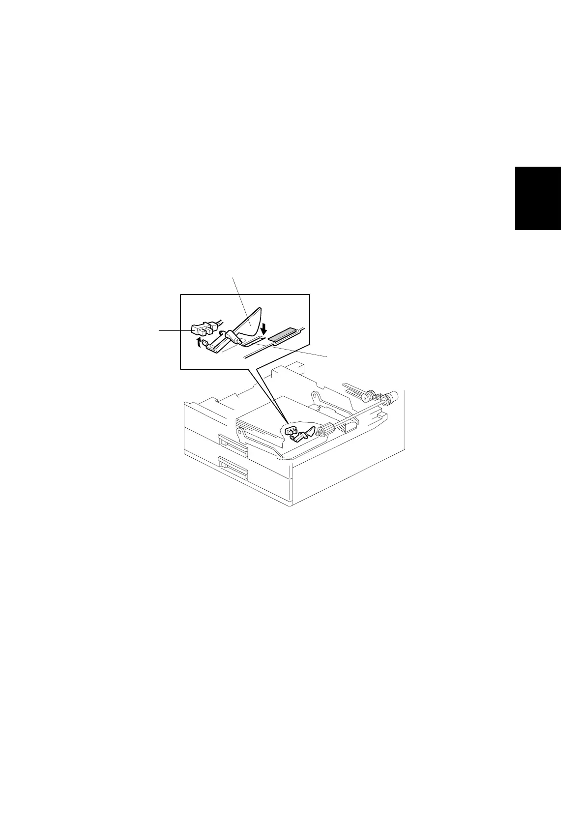 When the paper tray is pulled out, the pins [A, C] disengage from the couplings [B,