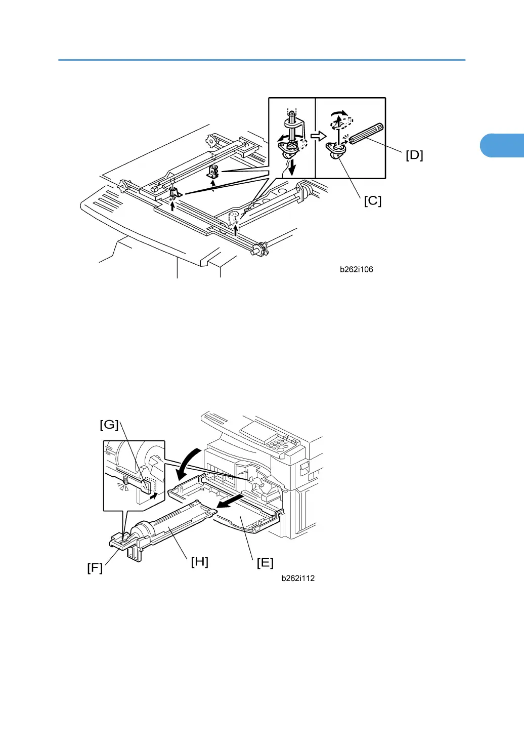 the pin [C], turn the pin 90 degrees, and pull it down and out.