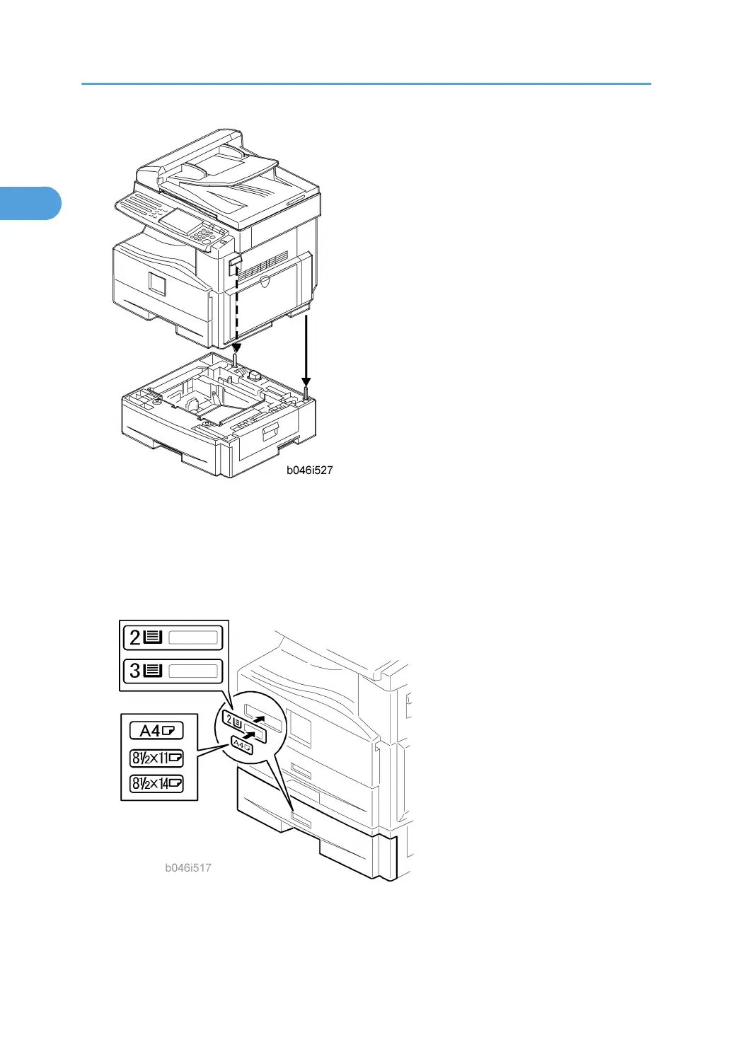 7. Stick on the appropriate tray-number decal and paper-size decal, at the locations indicated in the