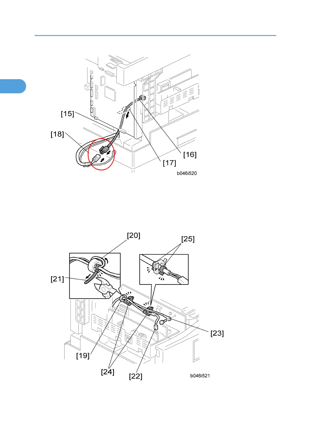 14. Pass the heater harness through the hole [15] at the rear of the copier.