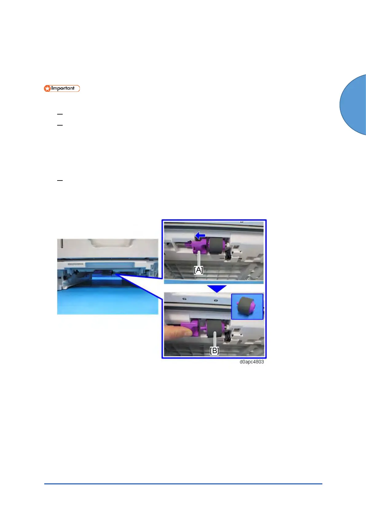 2. Slide the lever [A] to the left as shown below to remove the paper feed roller [B].