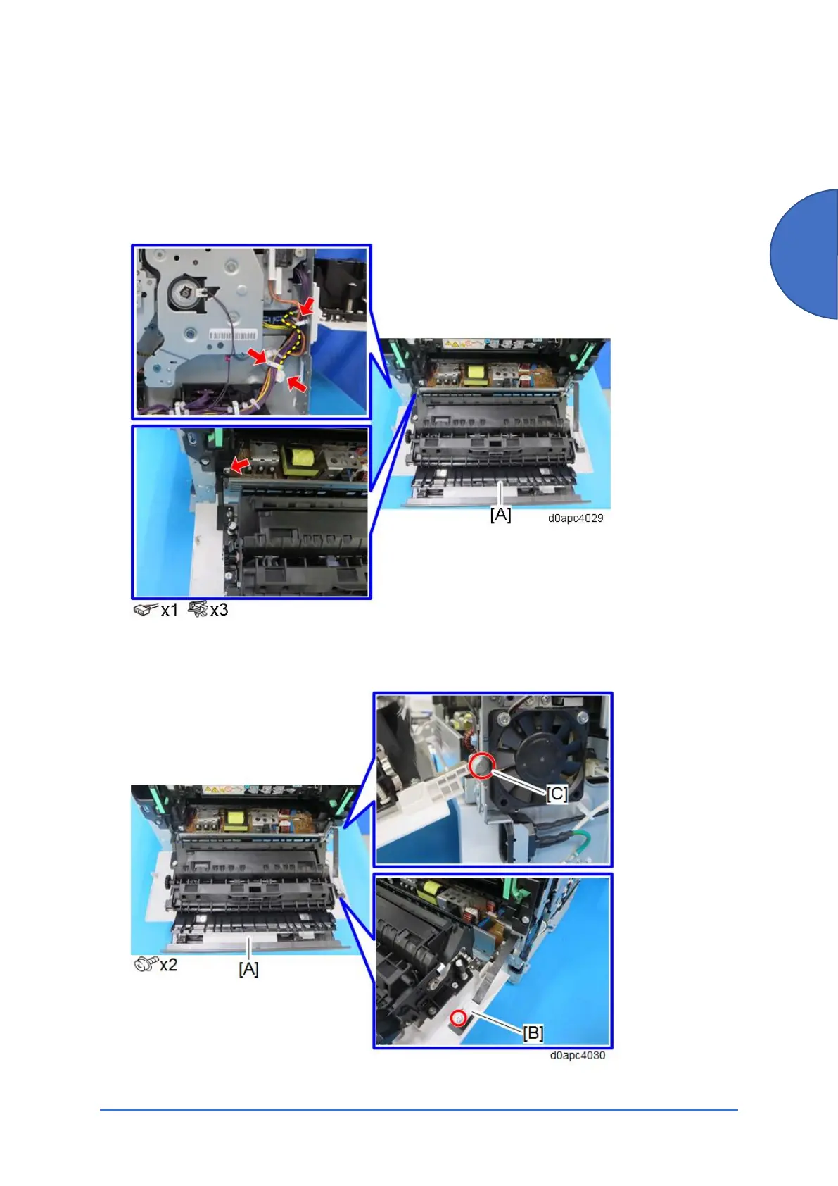 4. Remove the fastened part [B] for the belt of rear cover [A], and then remove the screw [C]