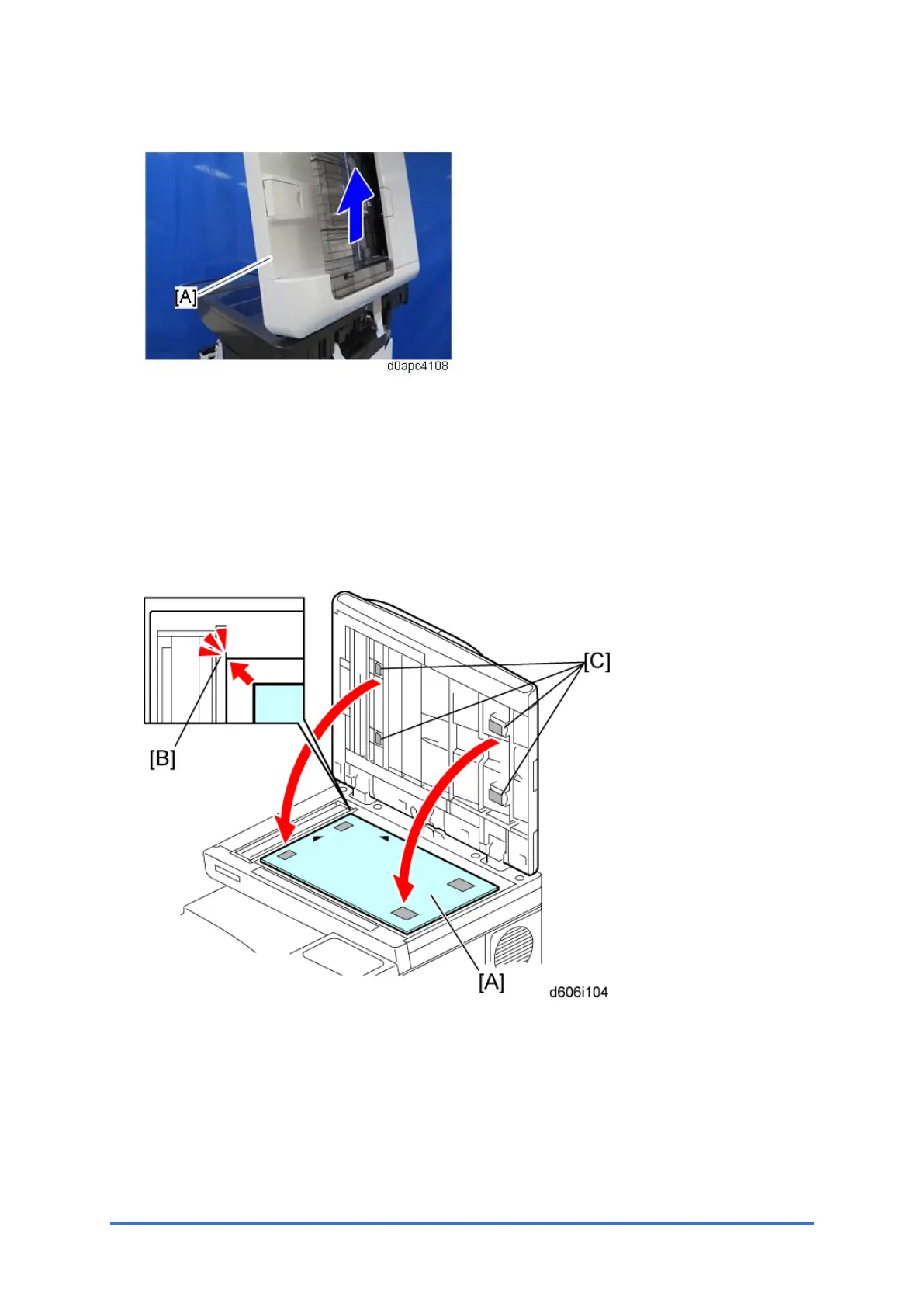 • Align the platen sheet with Velcro tape [C], with the rear left corner [B] on the exposure