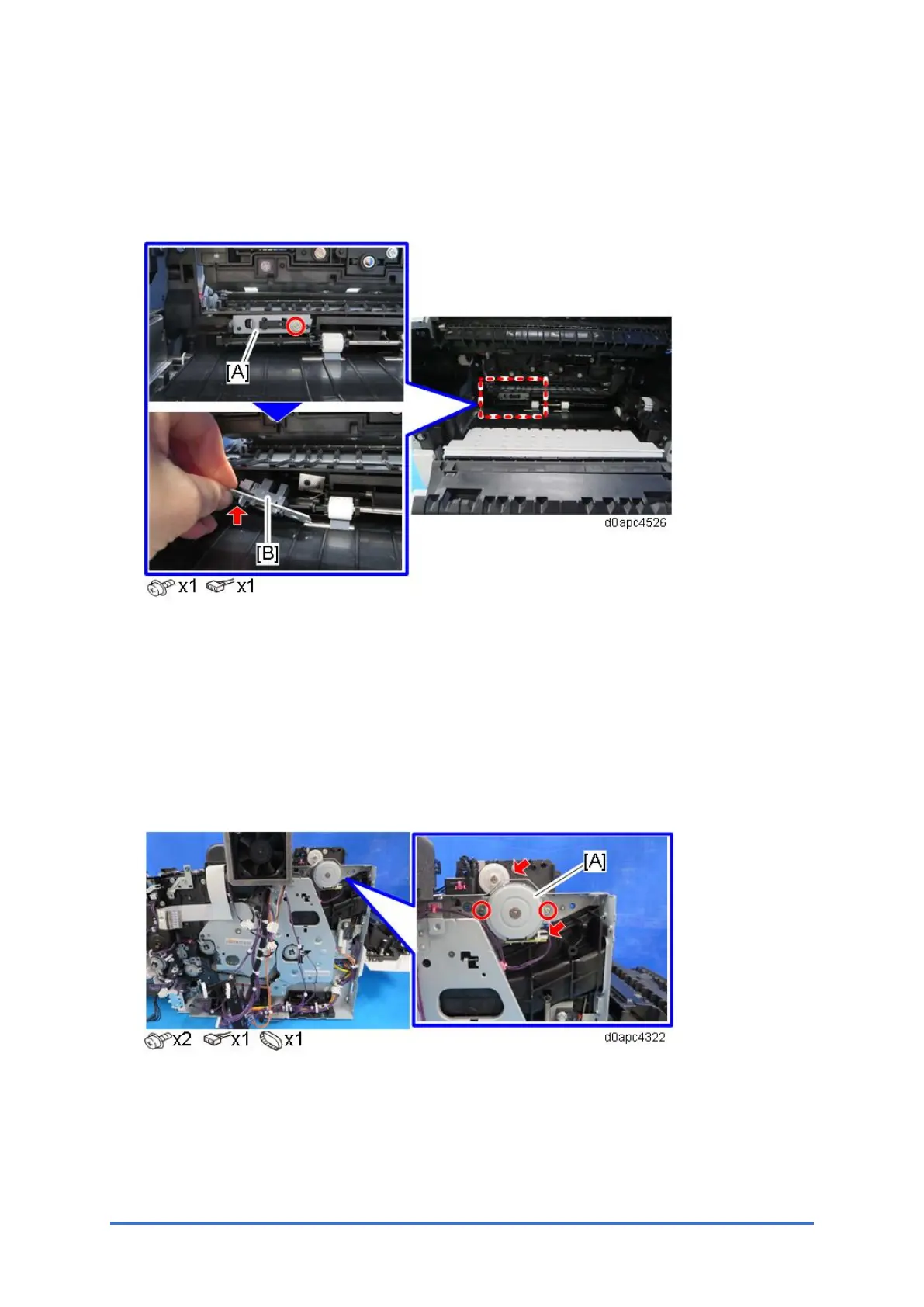 2. Remove the bracket [A], and then remove the duplex entrance sensor (S8) [B].