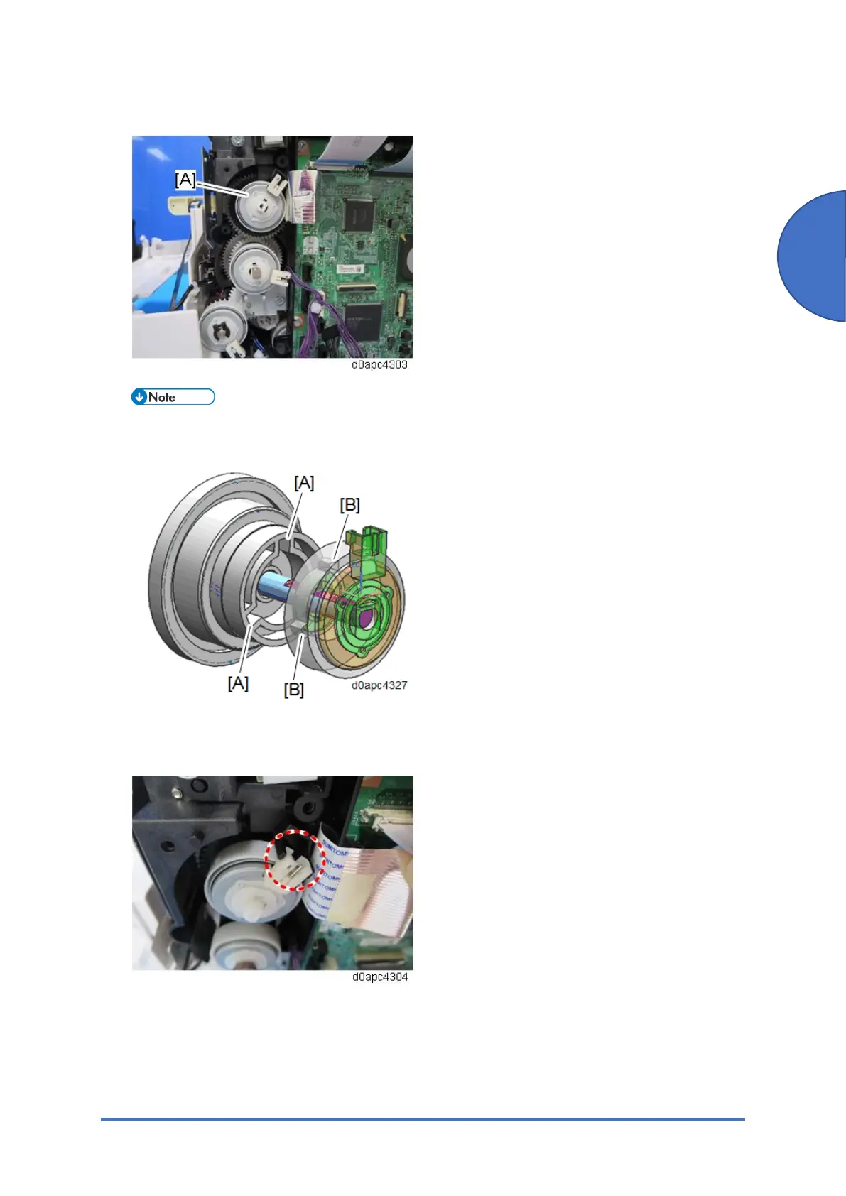When you install the toner supply clutch (CL2), match the gear notches [A] (x3) with the