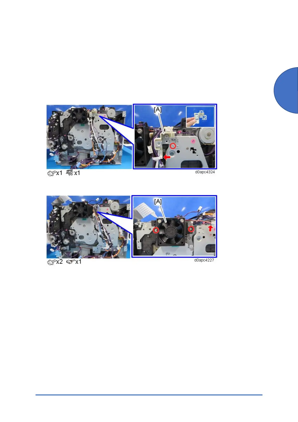 3. Printer model: Remove the PCDU cooling fan (right) (FAN1) [A] with the duct.
