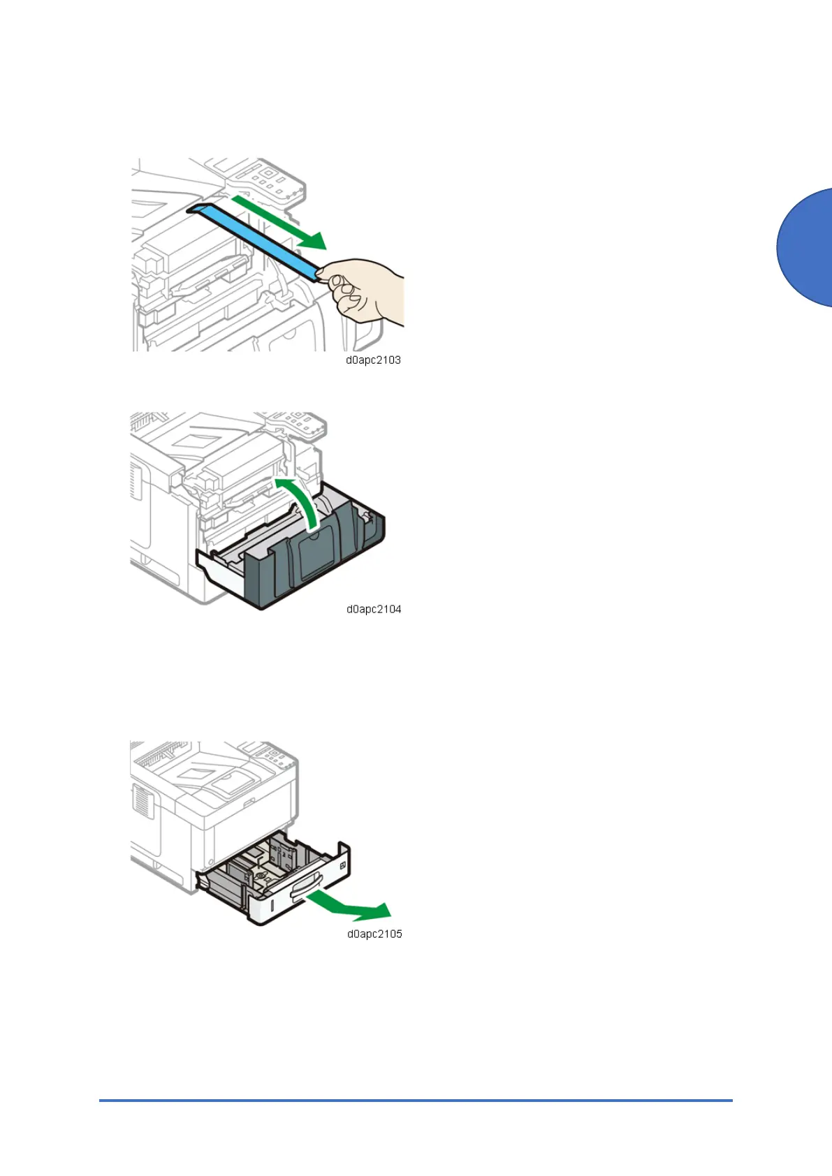 1. Pull out the paper tray carefully until it stops. Lift the front side of the tray, and then pull it