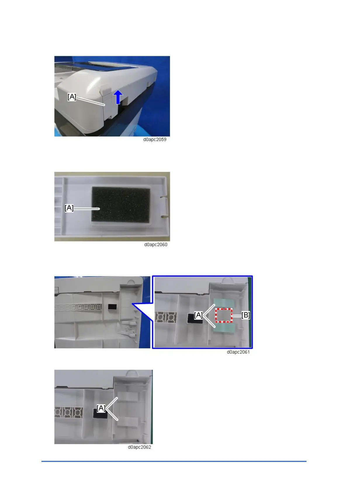 7. Attach the double-sided tapes [A] on the bottom of the SPDF beside the projection [B] as