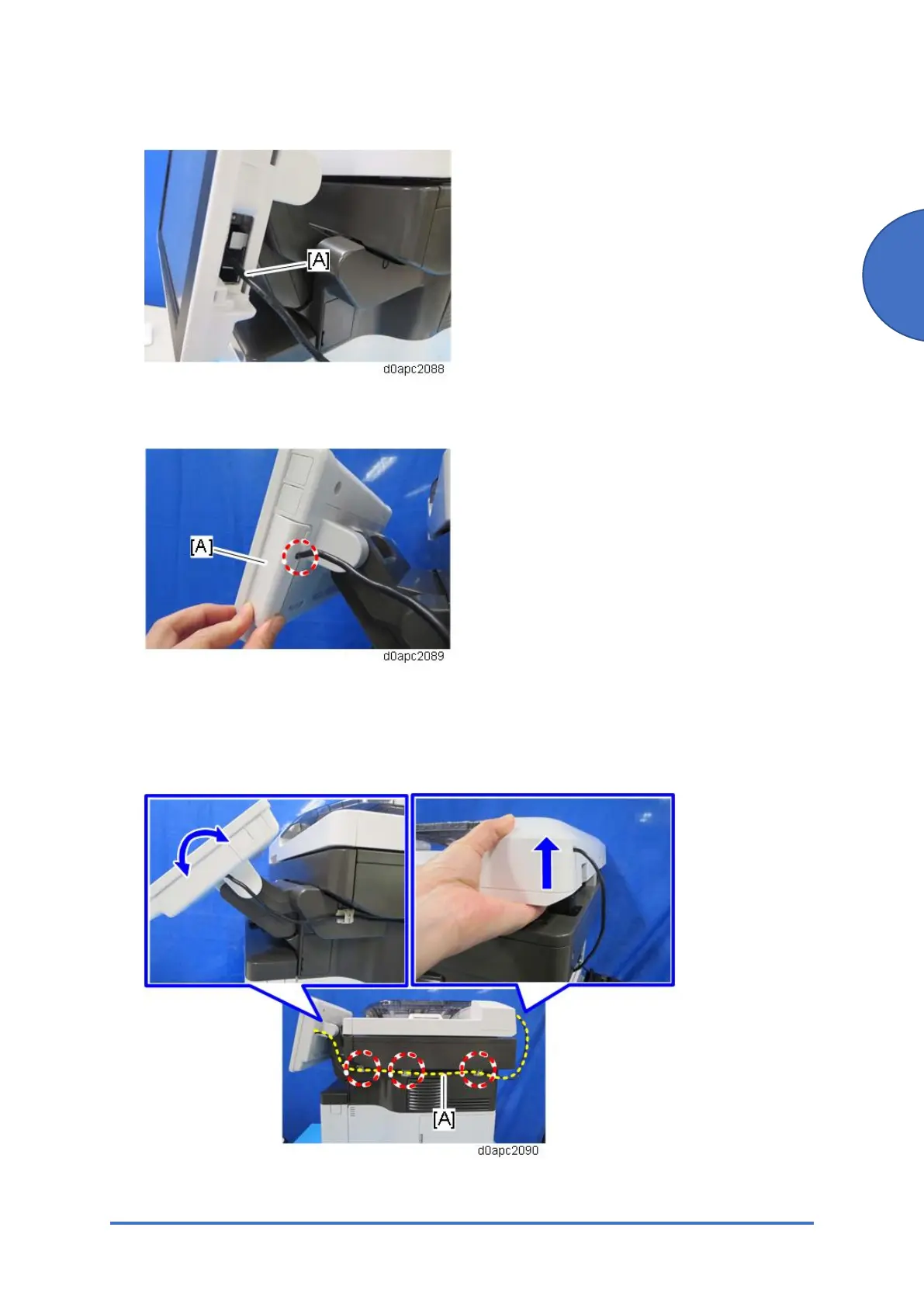 20. Pass the USB cable through the hole, and then attach the side cover [A] of the operation