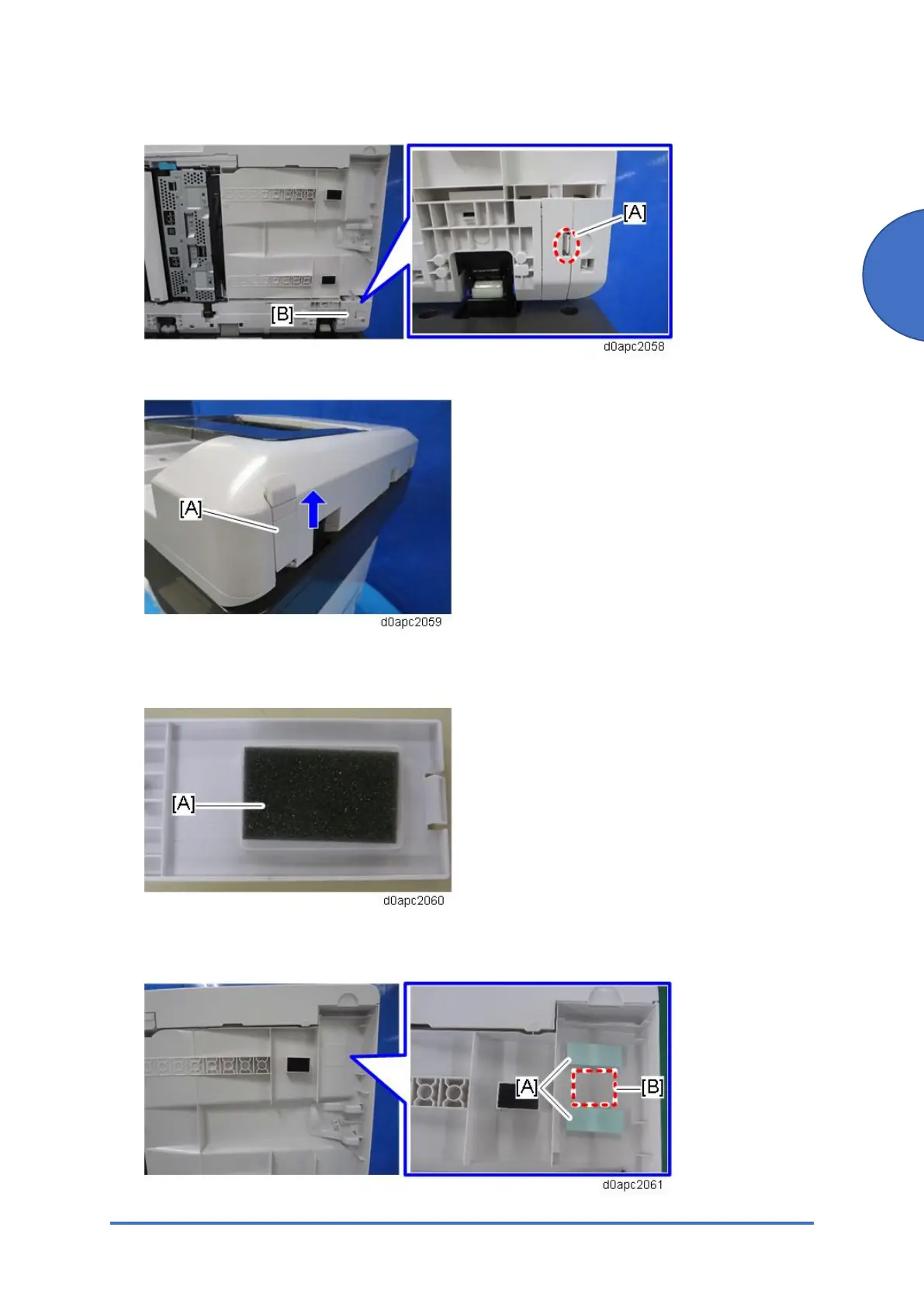 7. Attach the double-sided tapes [A] on the bottom of the SPDF beside projection [B] as