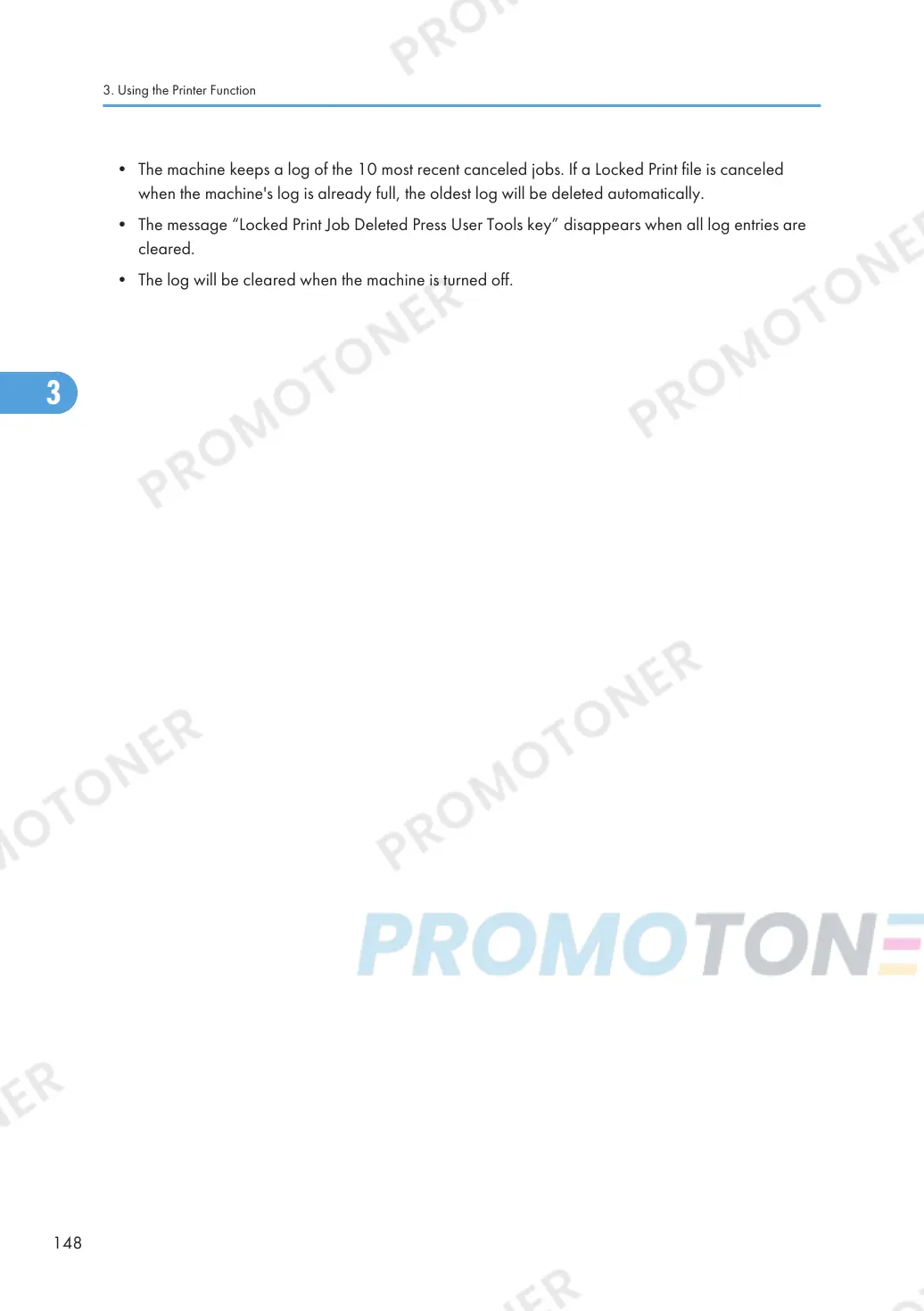 • The message “Locked Print Job Deleted Press User Tools key” disappears when all log entries are