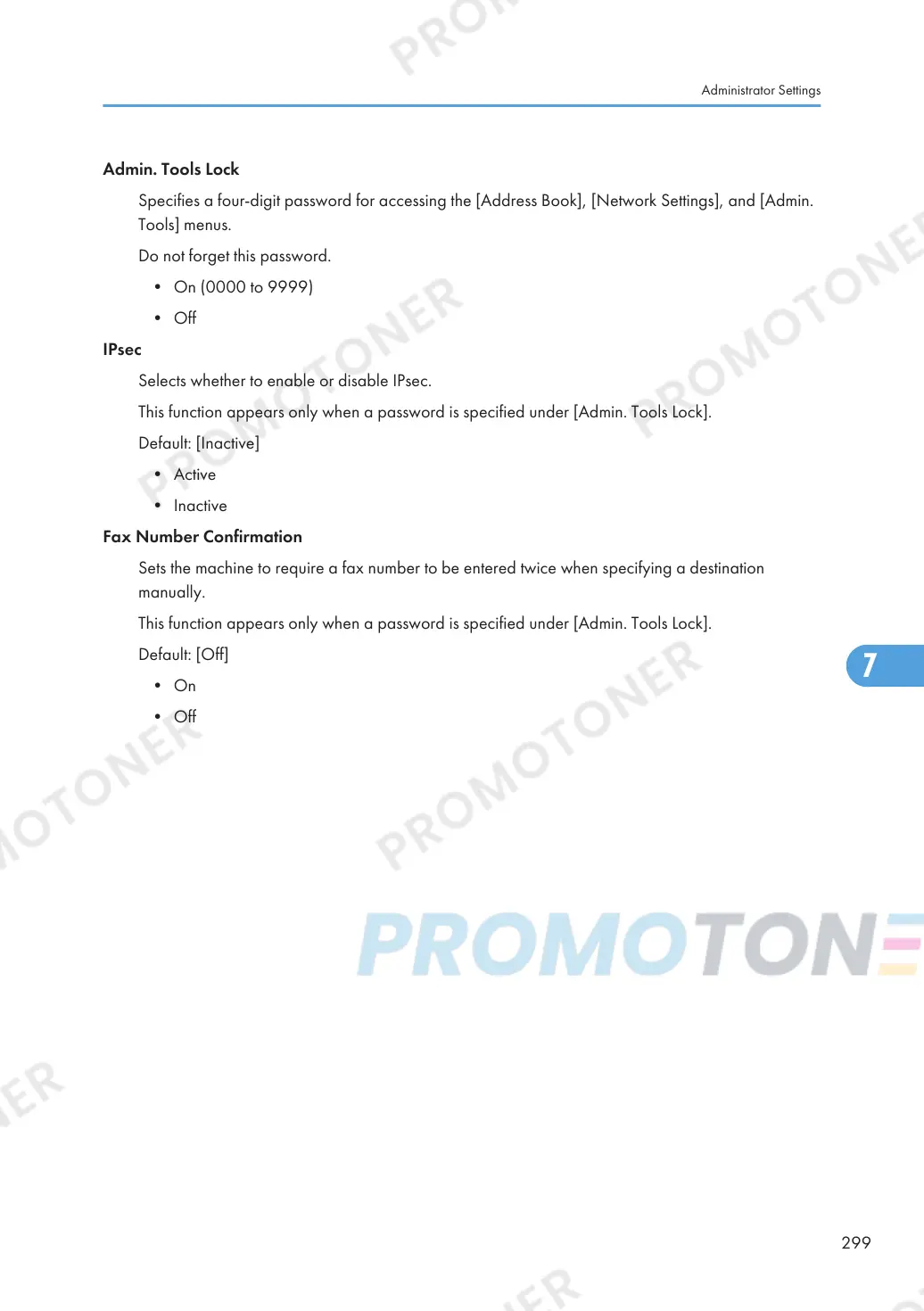 Specifies a four-digit password for accessing the [Address Book], [Network Settings], and [Admin.