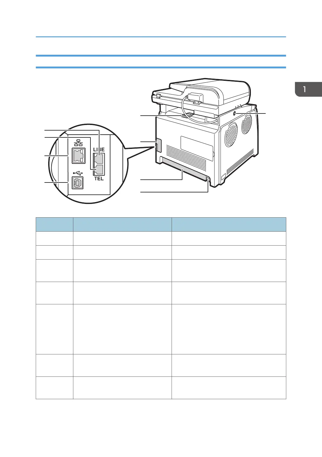 1 G3 (analog) Line Interface Connector For connecting a telephone line.