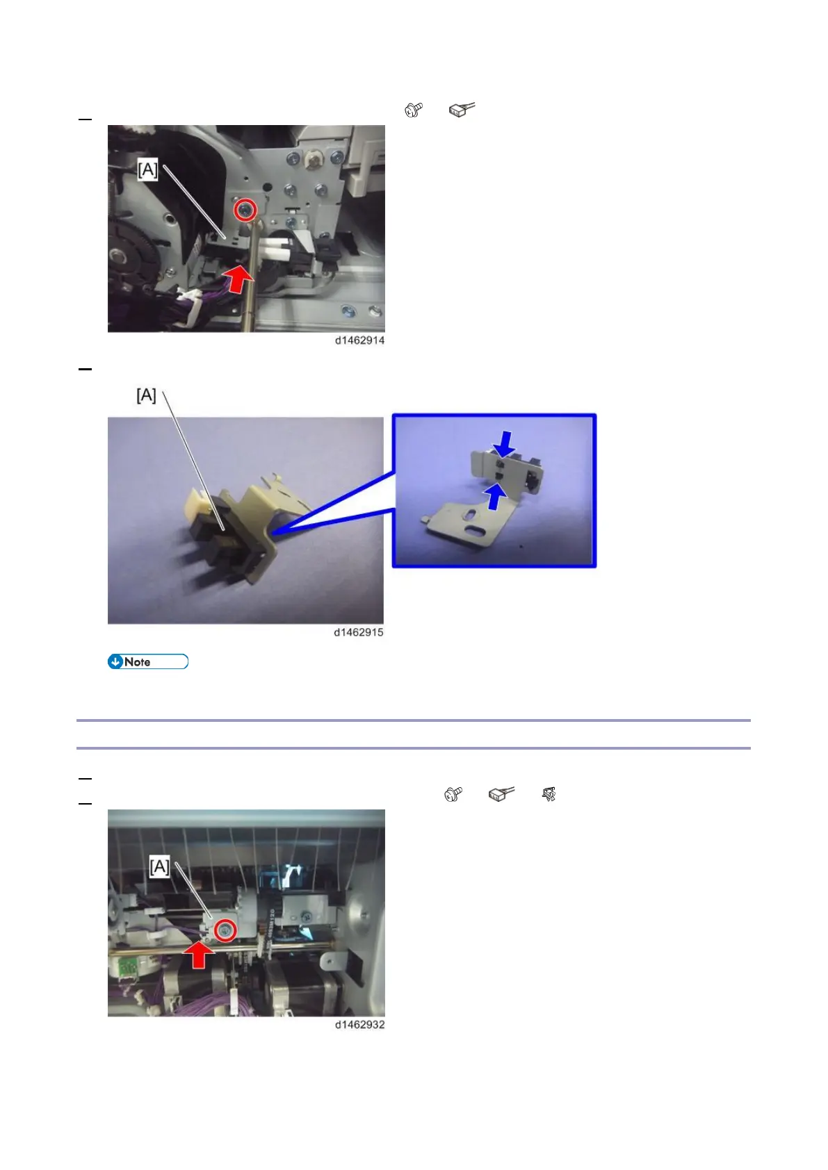 4. Remove the stapler move HP sensor unit [A] ( ×1, ×1).