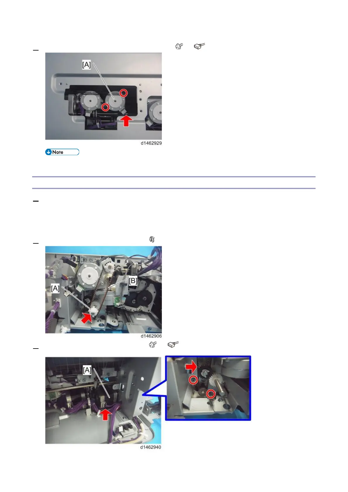 3. Remove the transport motor (M8) [A] ( ×2, ×1, Timing belt×1).