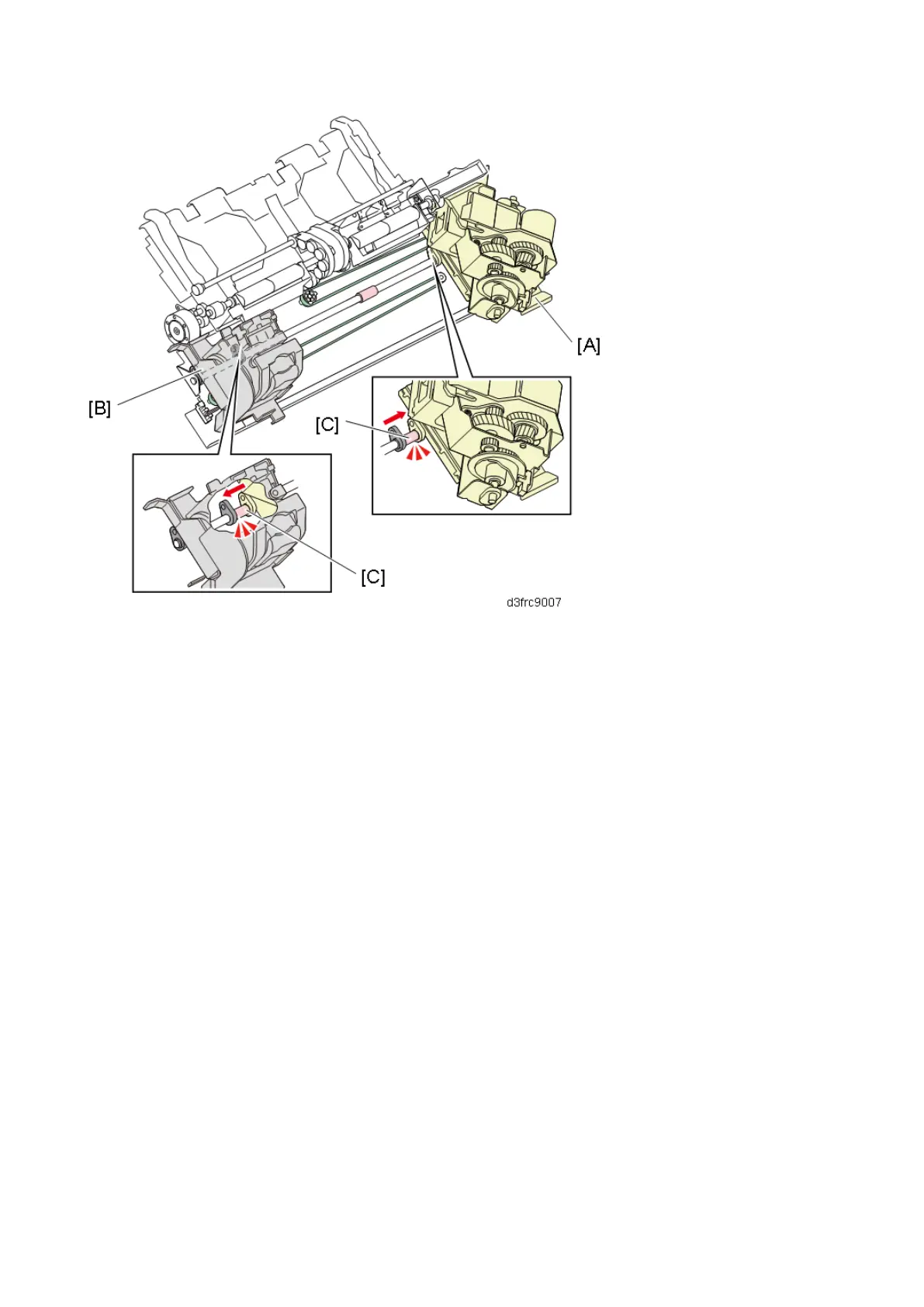 The cam [C] controlled by the Paper Guide Drive Motor (STM18) [D] pushes the paper guide [B] down