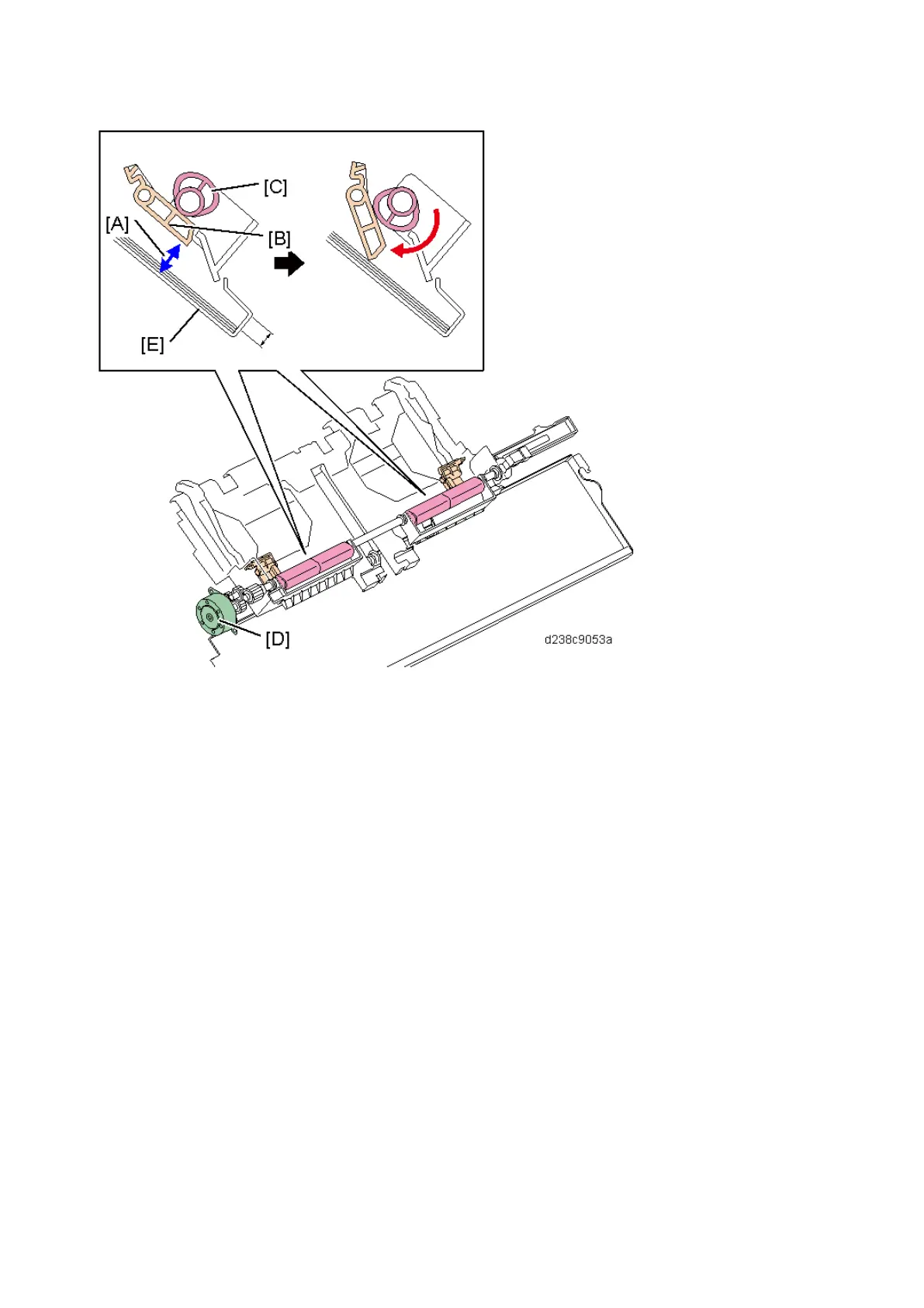 The Stapler Transfer Motor (STM6) [C] and the Stapler HP sensor (S36) [D] are attached to the base