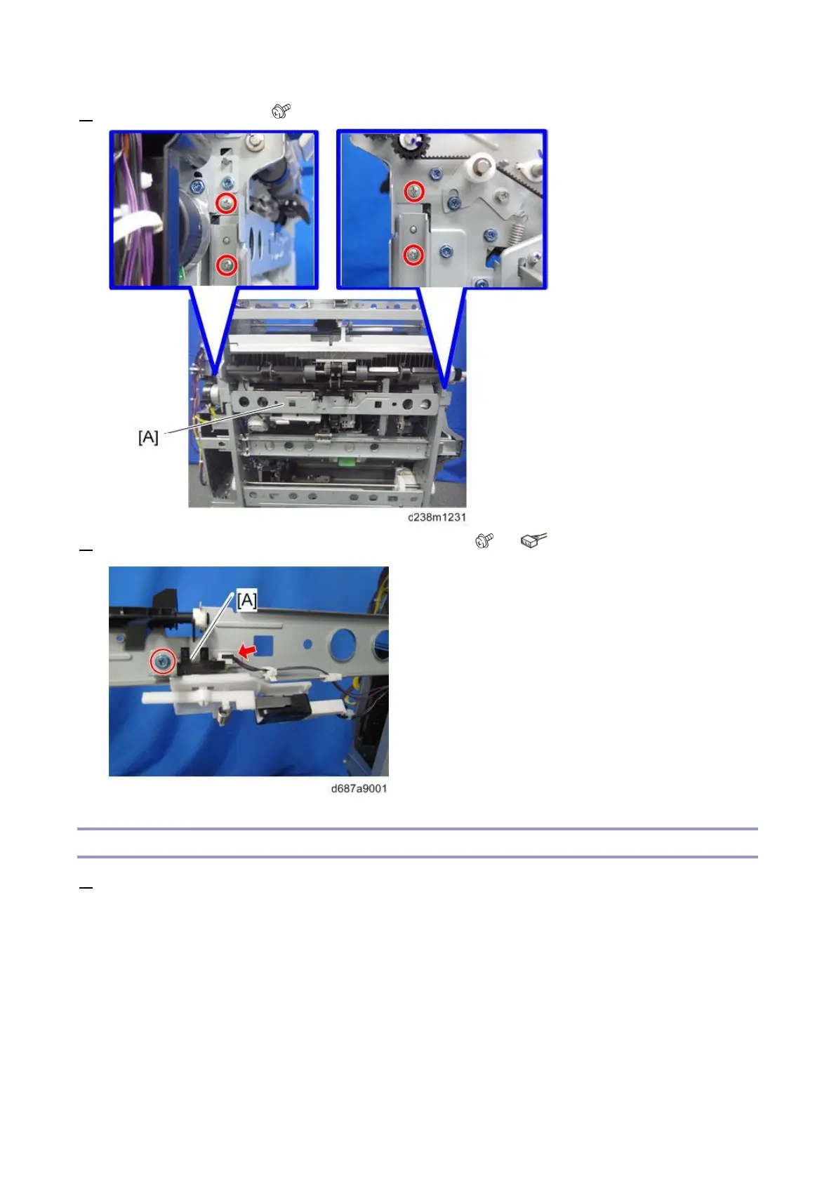 3. Remove the Shift Tray Paper Surface Sensor (S13) [A] ( ×1, x1).