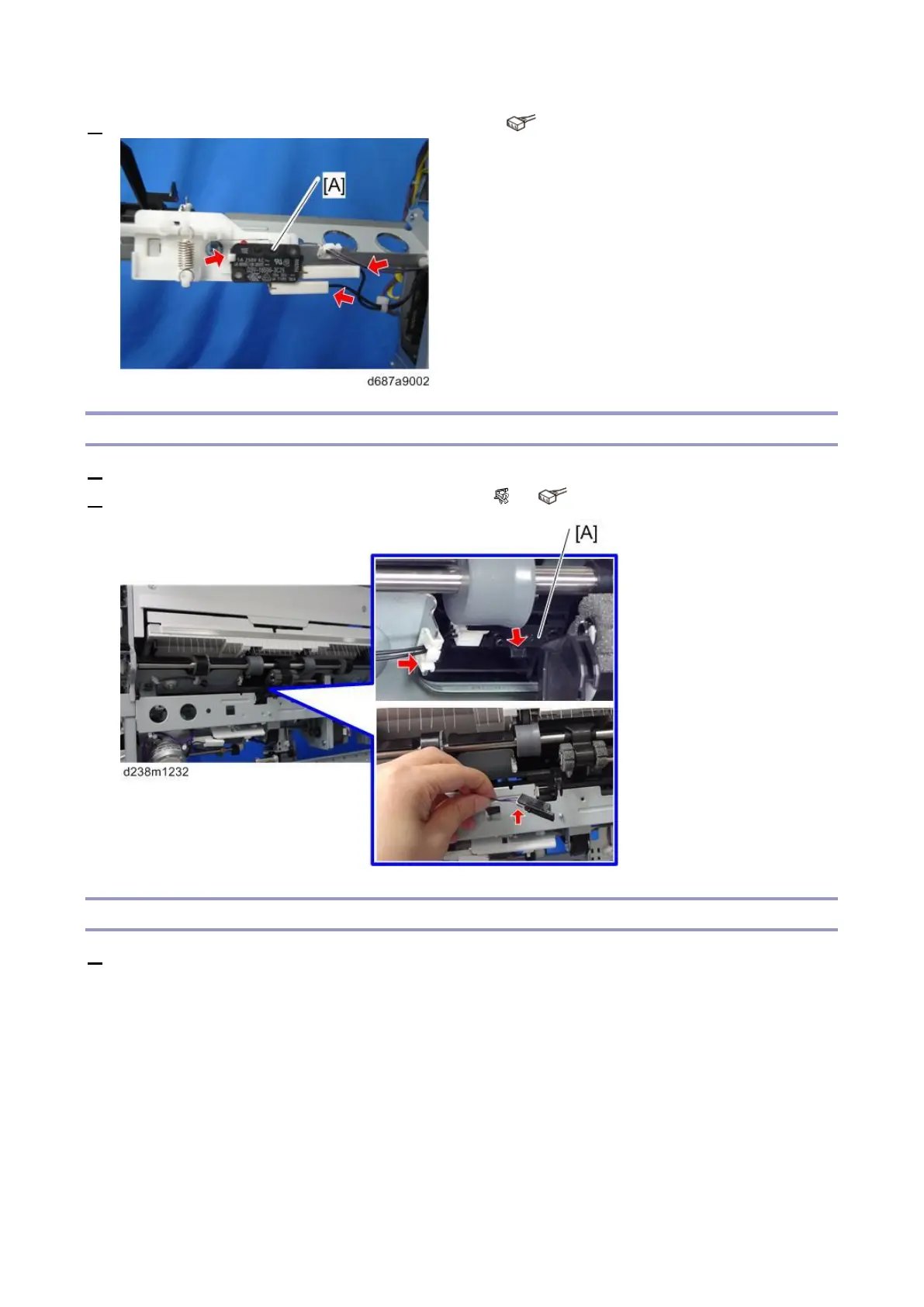 2. Remove the Shift Tray Upper Limit Switch (SW2) [A] ( x2, hook × 1).