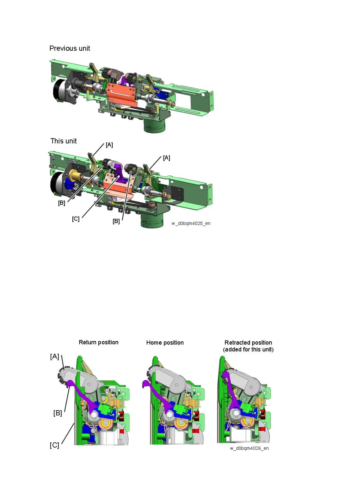 The stacking sponge roller [A] and actuator [B] move after the paper delivery (to the return