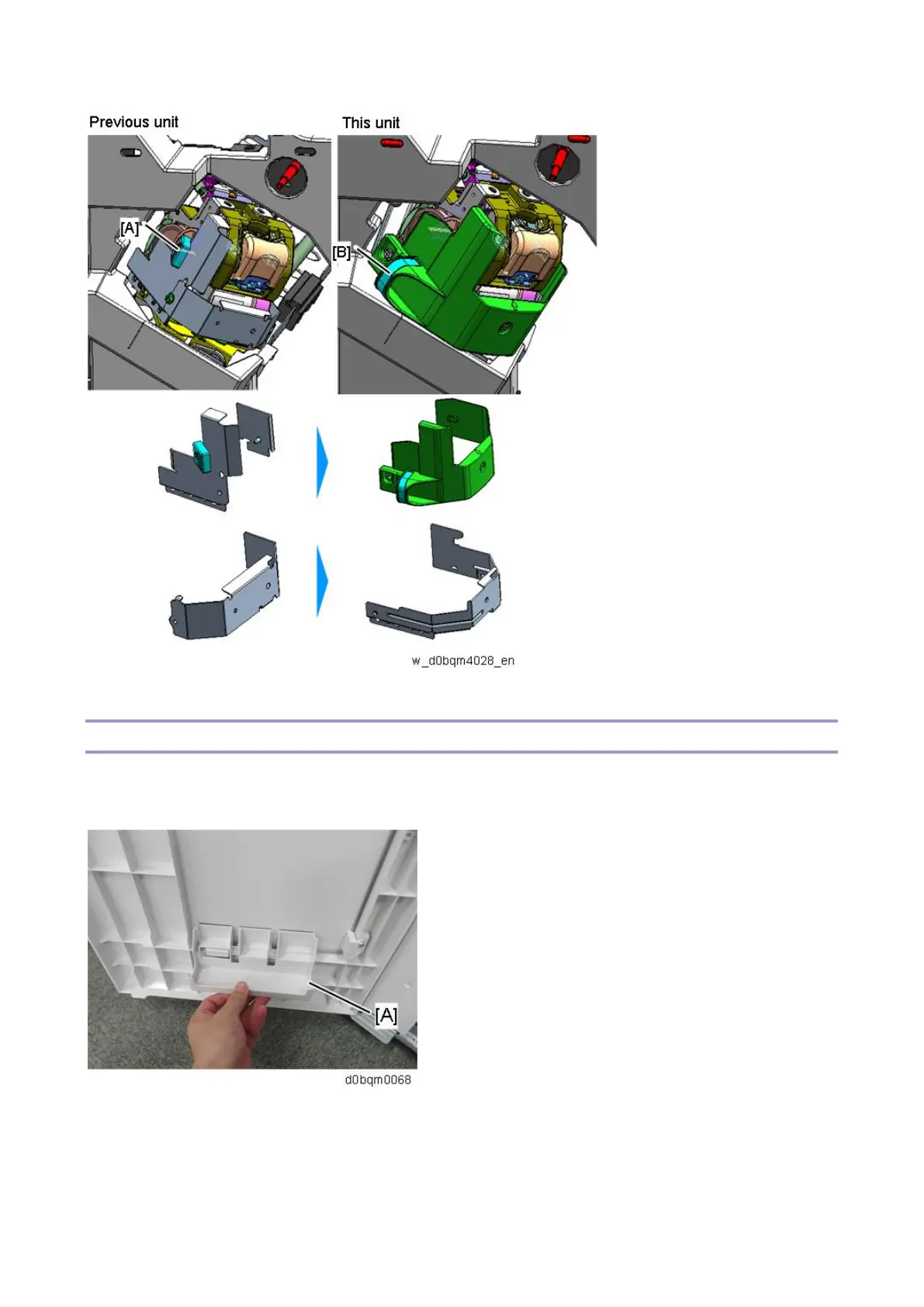 This stapler holder [A] is affixed to the back of the finisher's front door with double-sided tape.