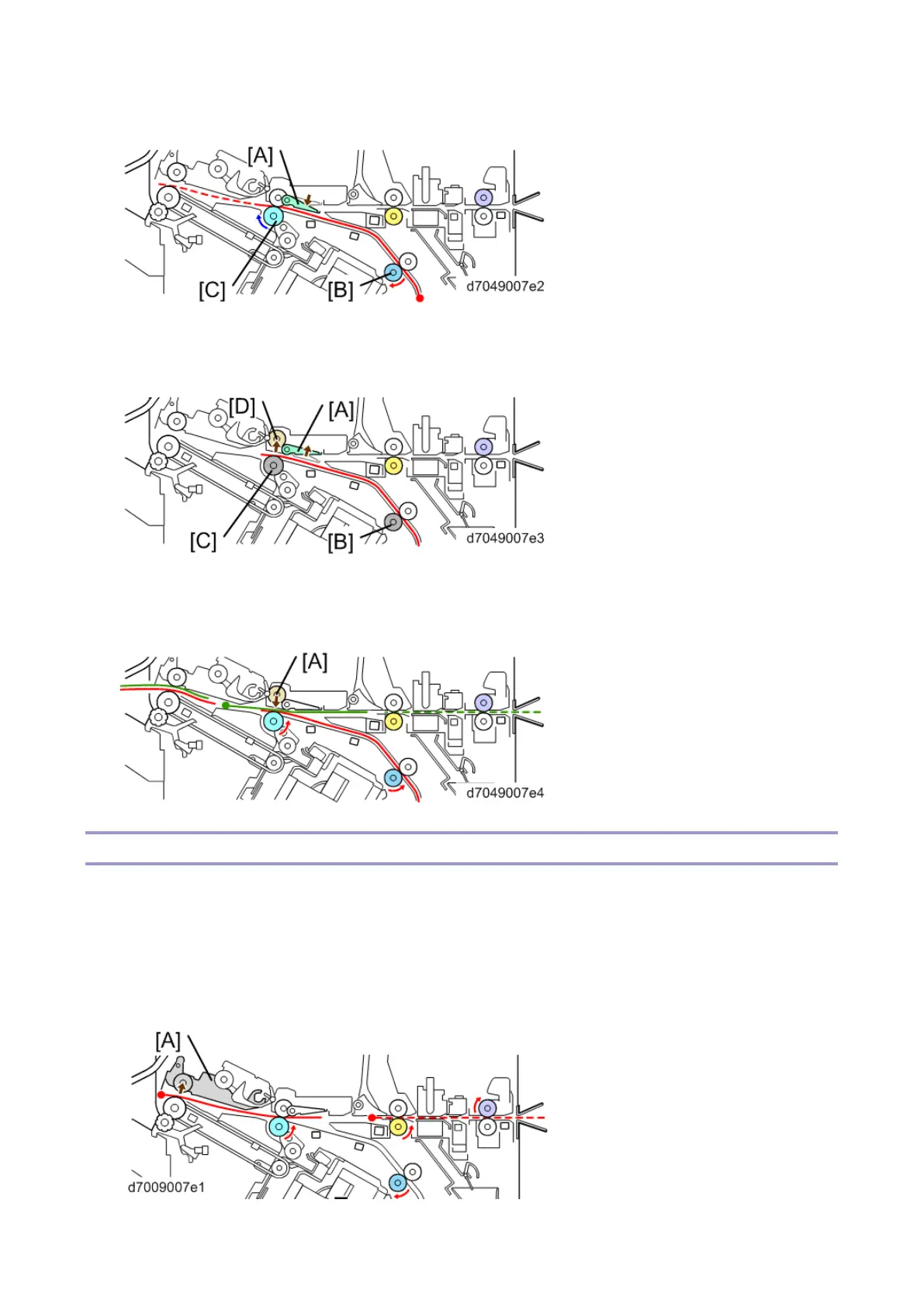 1. The upper tray exit guide plate [A] moves up (opens). Paper comes through the entrance transport