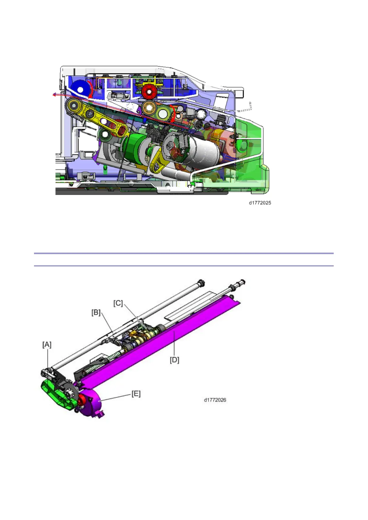 The junction gate motor [E] drives the junction gate [D], trailing edge presser [B], and the reverse rollers