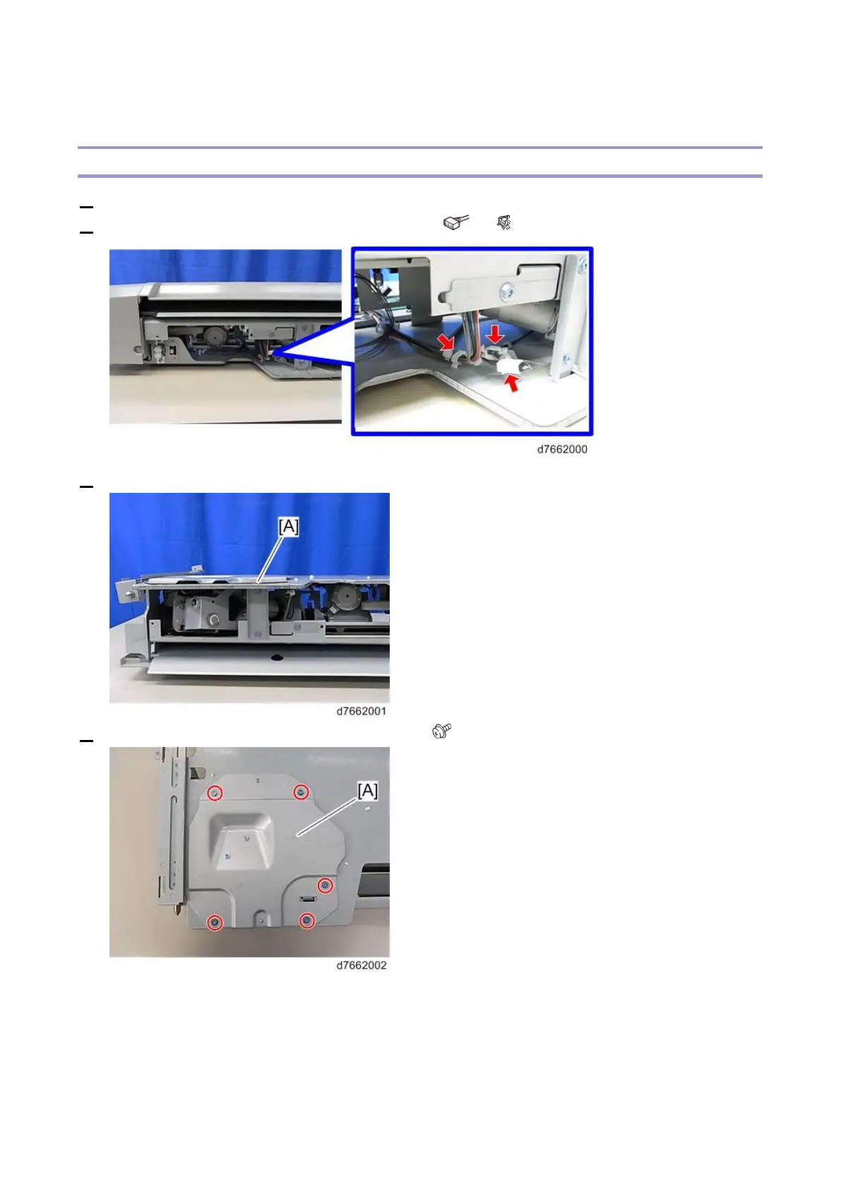 4. Remove the screws securing the stapler unit [A] ( ×5).