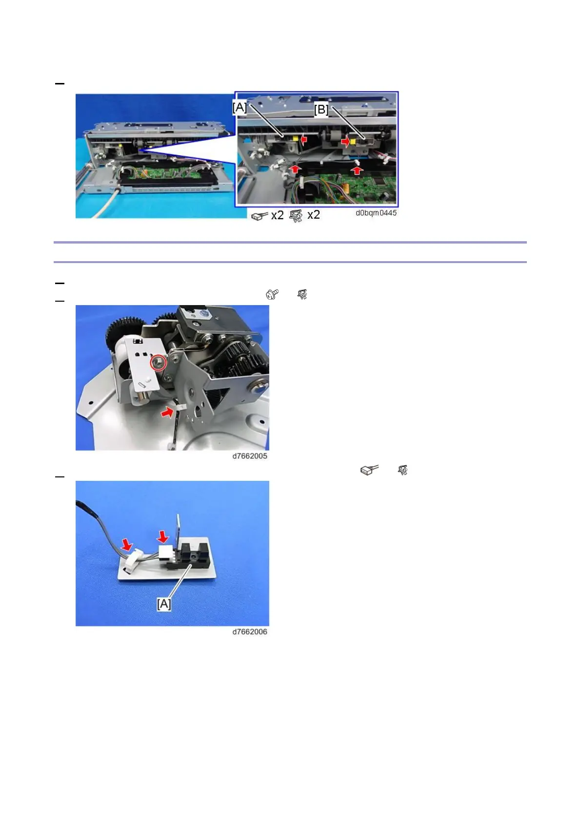 2. Remove the paper exit full sensor 1 (S4) [A], paper exit full sensor 2 (S5) [B].