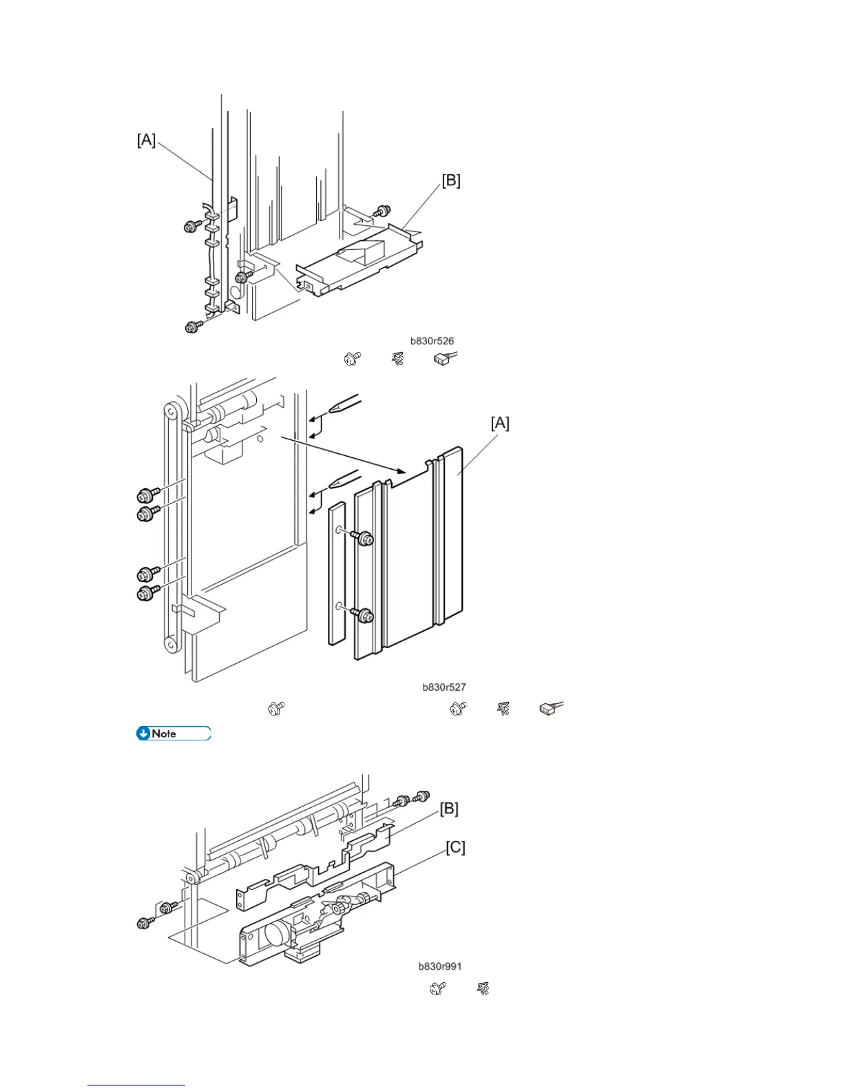 4. Remove the Cover [B] ( x 4) and the motor stay [C]. ( x4, x7, x4)