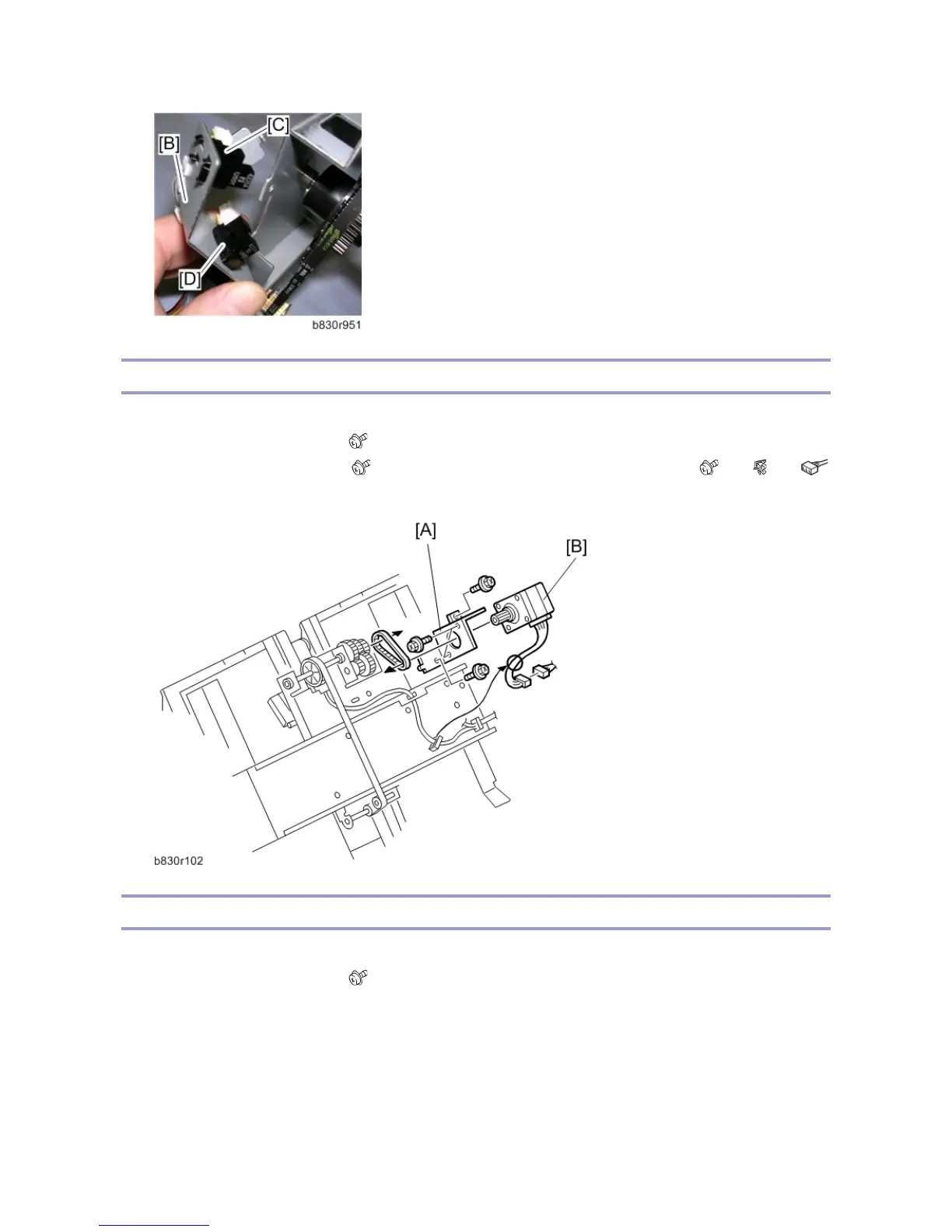 3. Remove the motor bracket [A] ( x2, timing belt x1) and jogger top fence motor [B]. ( x2, x1,
