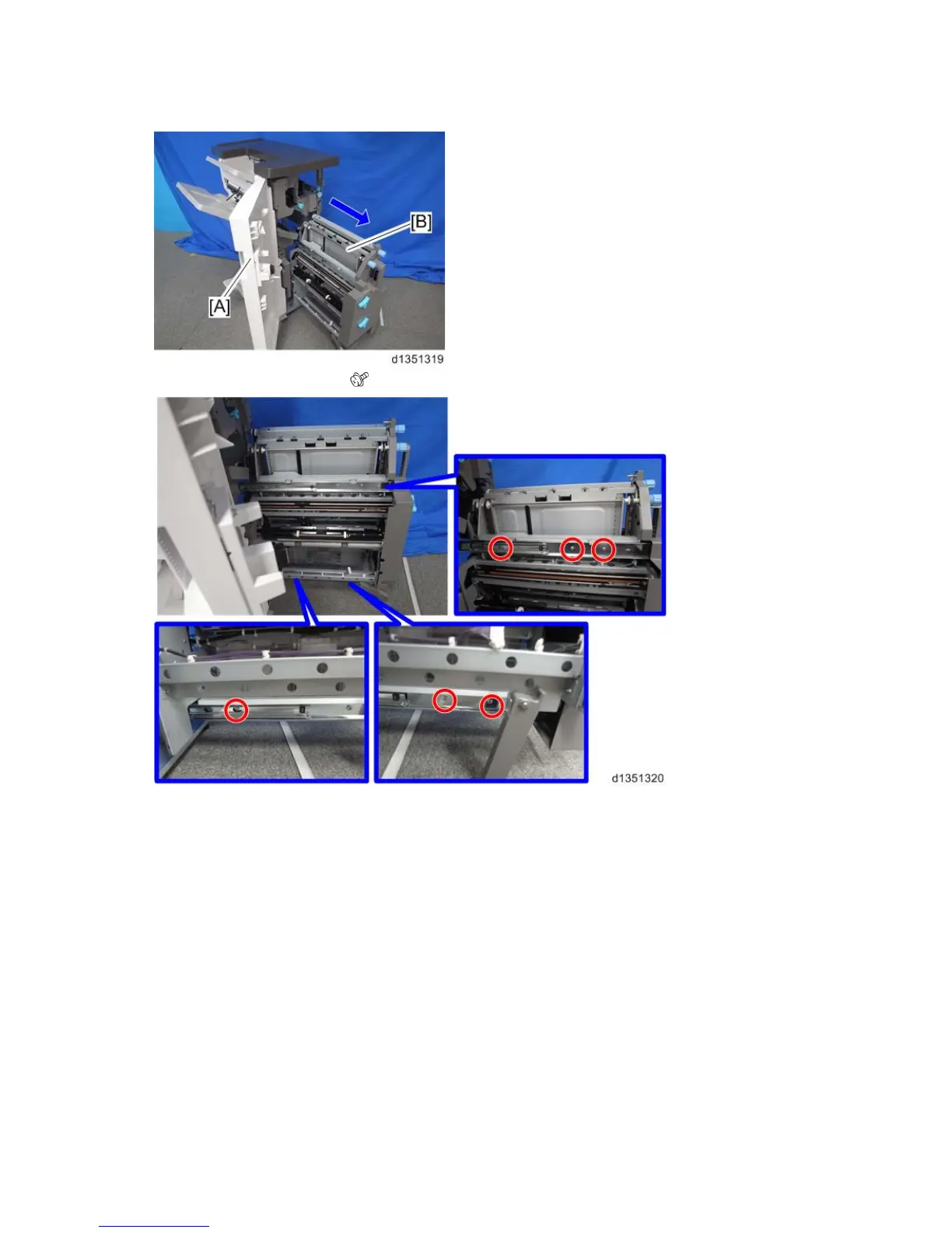 5. Open the front door [A] and pull out the booklet stapler unit [B].