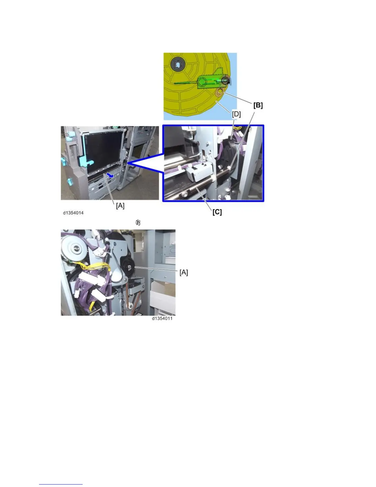 [B] on the rear end of the fold plate shaft [C] is aligned with the fold plate positioning cam [D].