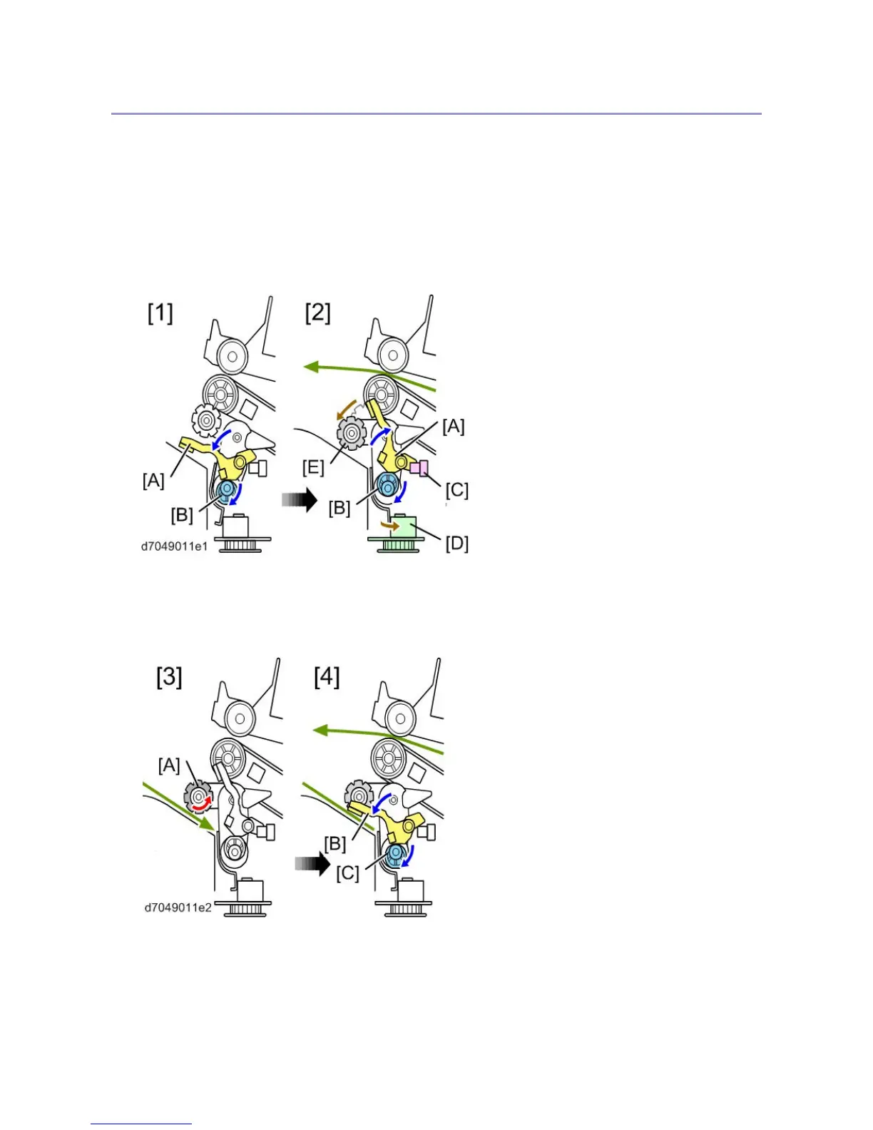 1. When a job starts, the paper stacking holder motor rotates the paper stacking holder cam [B] to shift the