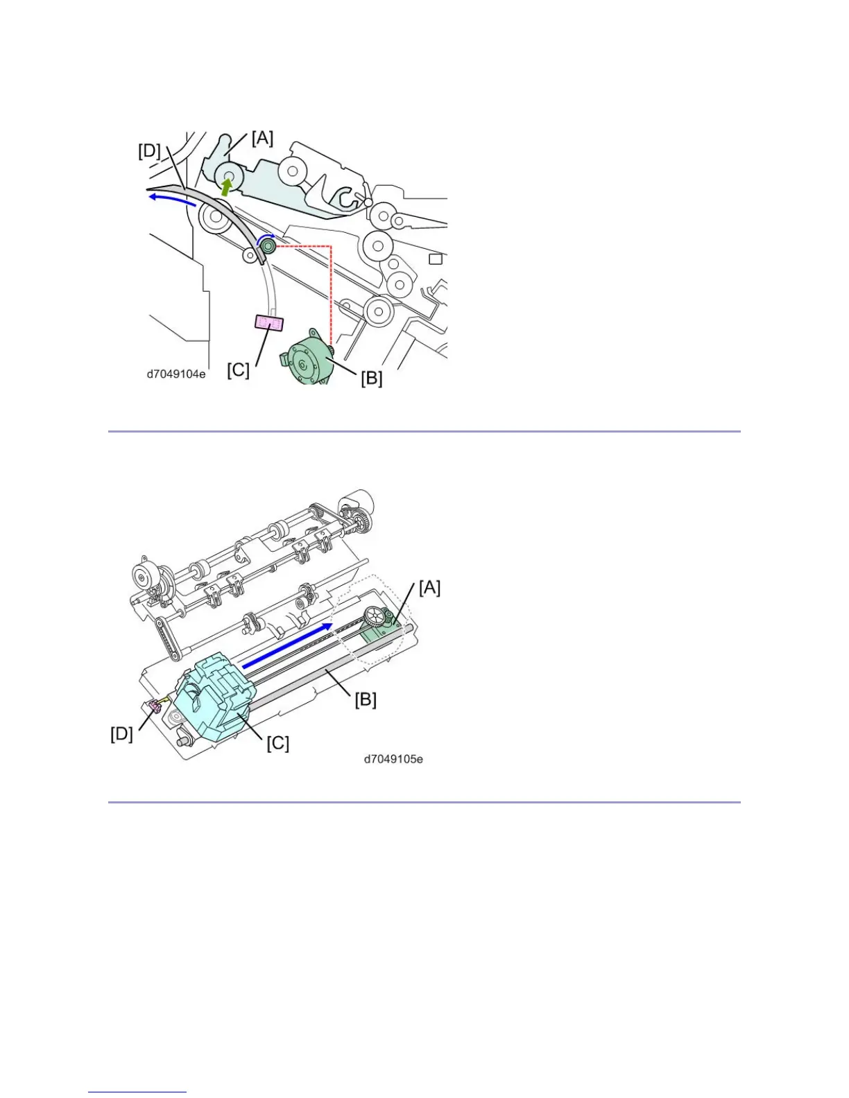 1. The positioning roller motor [B] rotates the positioning roller [D] to feed the paper to the stapler tray.