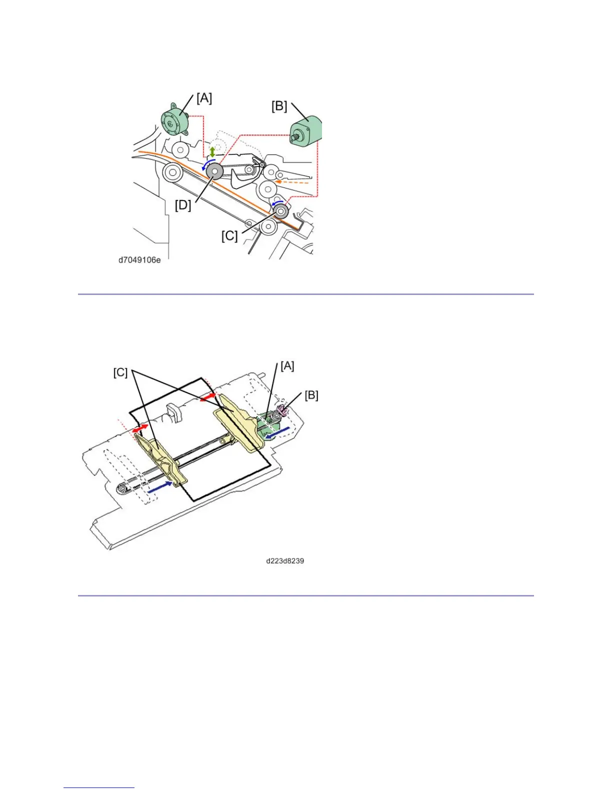 The jogger motor [A] moves the jogger fences [C] to the ready position and waits for the first sheet. As each sheet