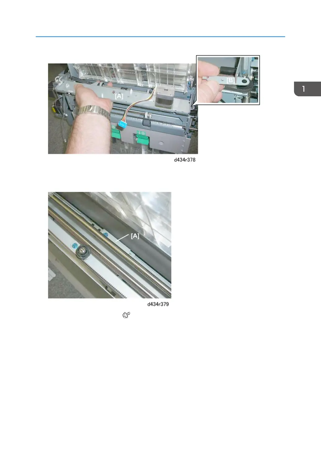 9. Rotate then slide the guide shaft [B] to the rear until you have enough space to remove the bracket