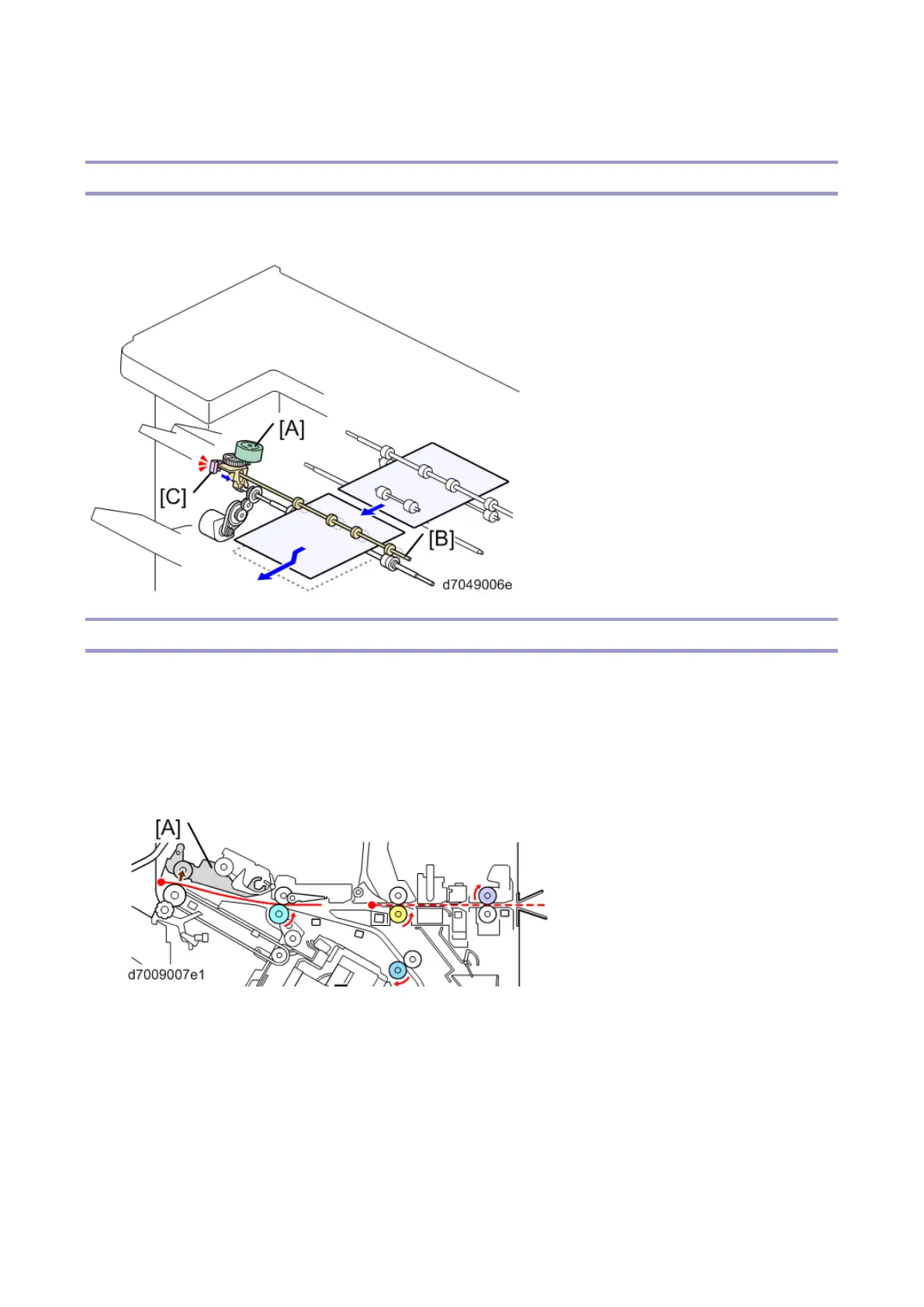 1. The upper tray exit guide plate [A] moves up (opens). Paper comes through the entrance transport