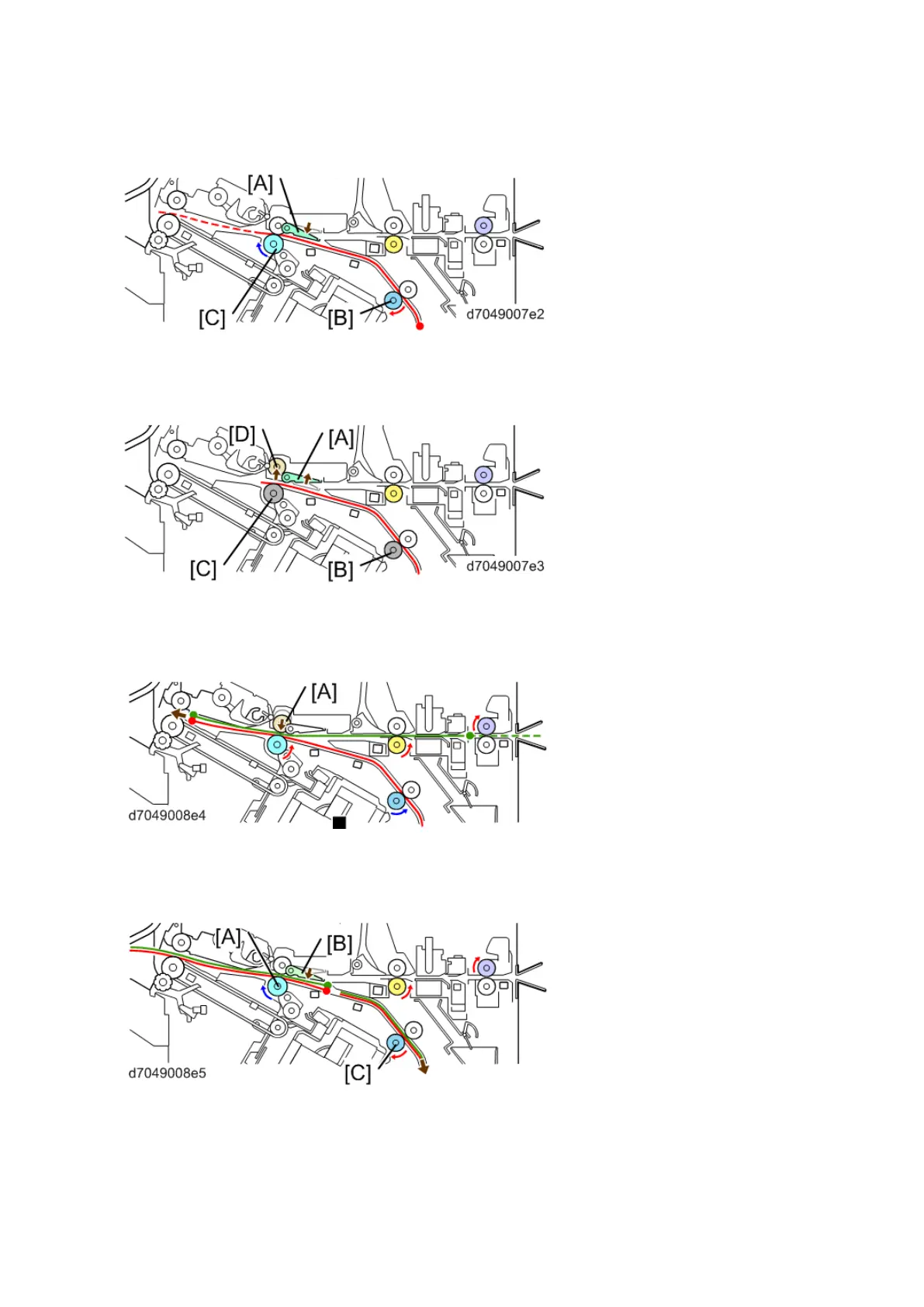2. The pre-stack junction gate [A] drops (closes) and the relay transport roller [C] rotates in reverse.