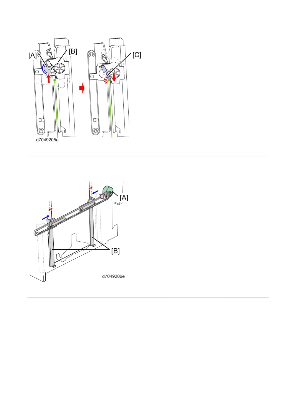 The booklet jogger motor [A] moves the jogger fences [B] in to align the sides of each page. When a job