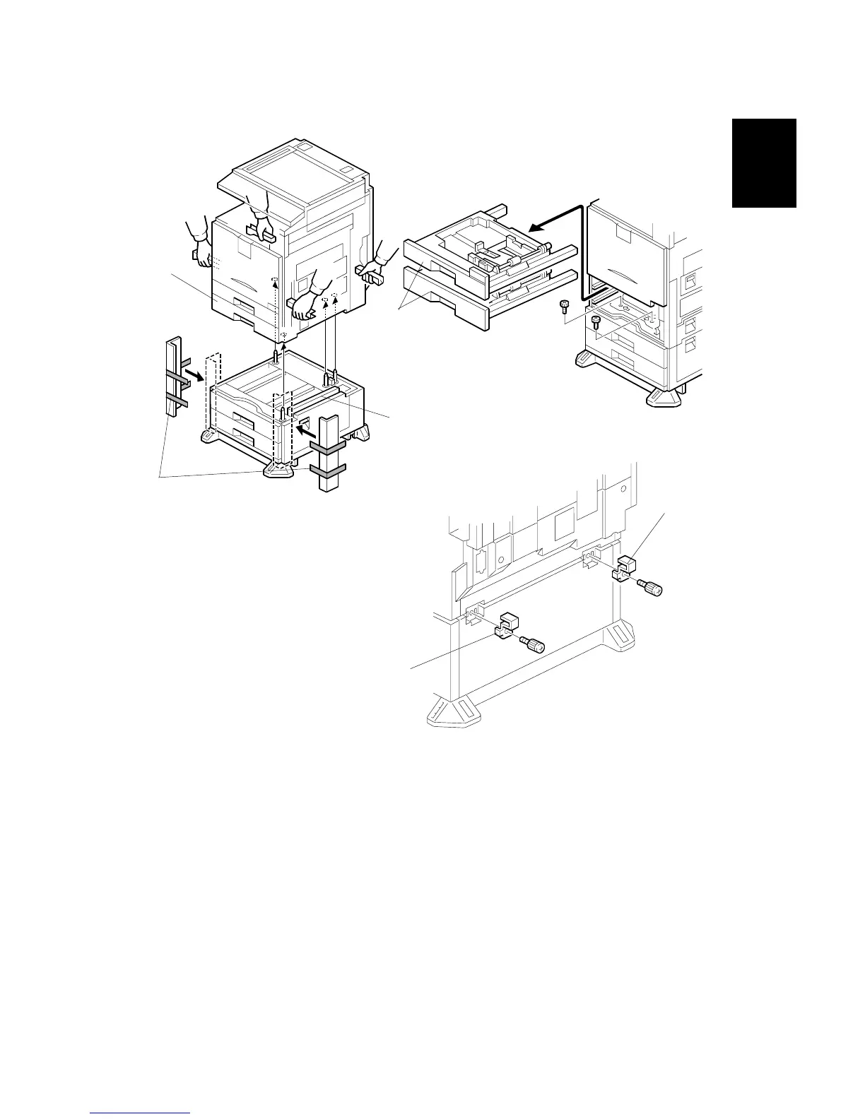 9. Remove the paper trays [D] from the copier and secure the paper tray unit