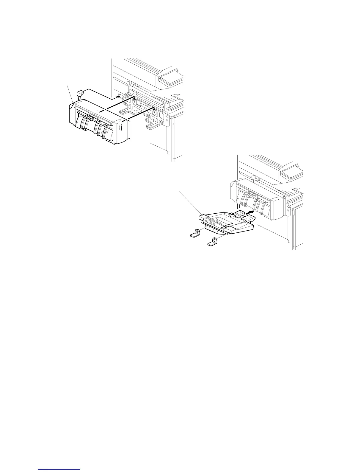 6. Install the output tray [B] as shown (2 snap rings).