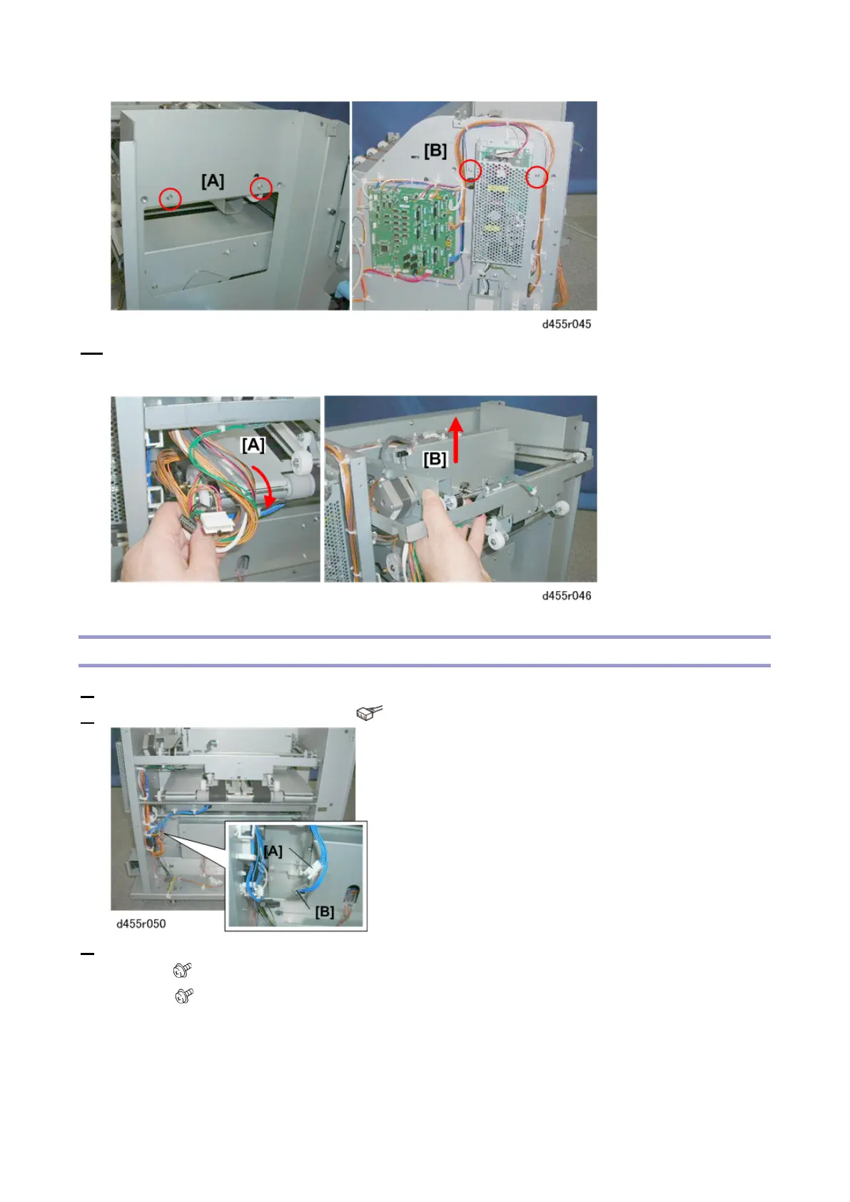 12. Pull the harnesses [A] out from behind the shaft. Lift the trim positioning unit [B] straight up and