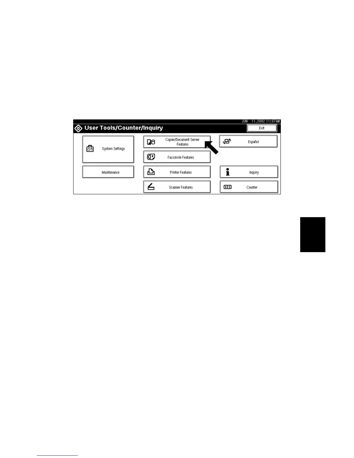 2. Hold down the ! key and then touch Copier/Document Server Features.