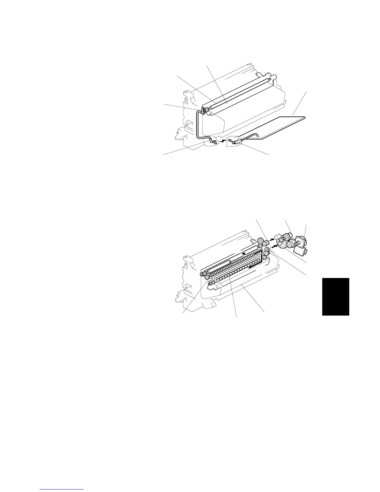 Fusing unit motor [C] " drive gear [D] " gears [A] and [E] " cleaning brush [J]