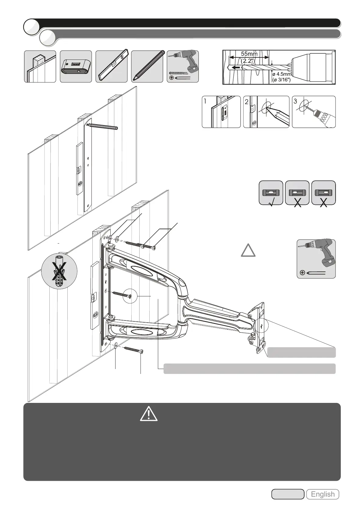 • Stellen Sie sicher, dass die Befestigungsschrauben in der Mitte der Balken verankert sind. Die Verwendung eines