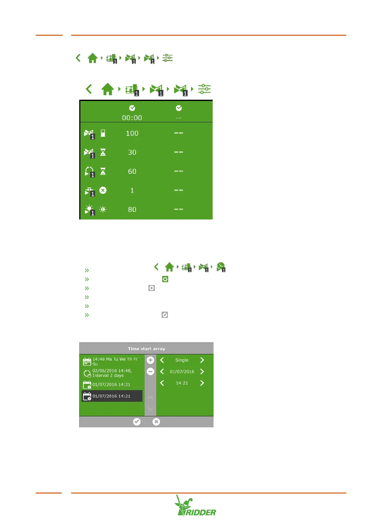 Tap the Settings icon ‘ '. The Time start array screen appears.