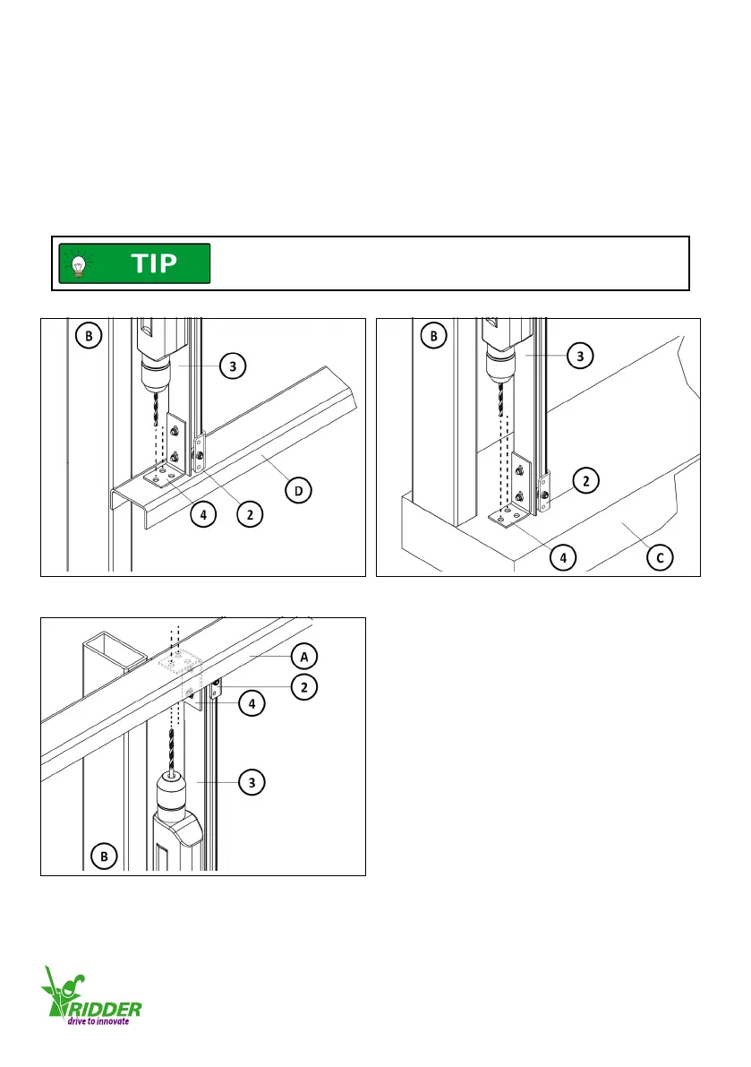 2. Drill the holes of Ø9 mm for the bolts M8 (14) (2x or 3x) in the purlin (A).