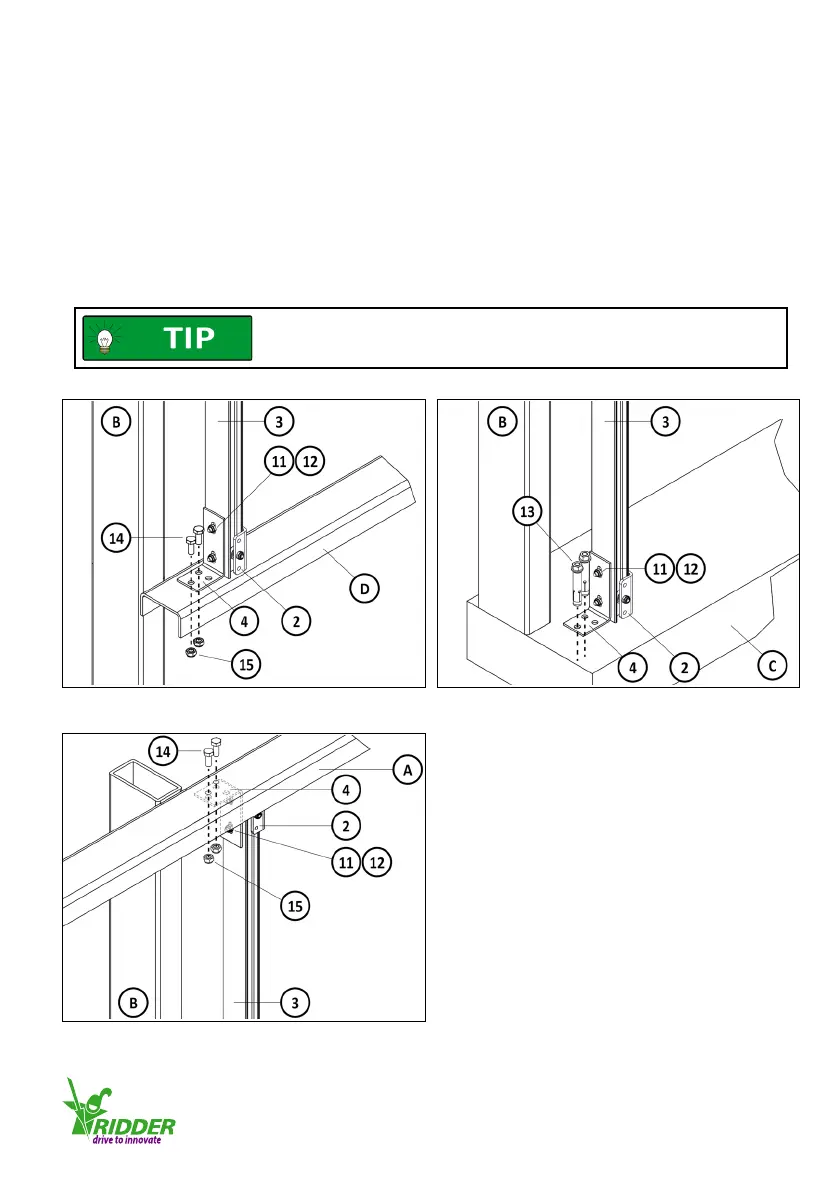 2. Aach the mounng bracket (4) with bolts M8 (14) (2x or 3x) and self-locking nuts (15) to the